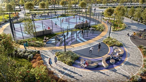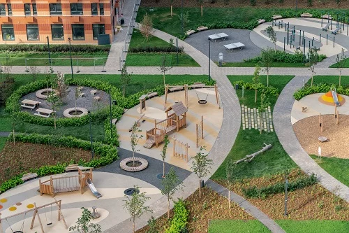 В проекте предусмотрена вся необходимая инфраструктура для комфортной жизни: три школы, семь детских садов и поликлиника. Между домами проходит пешеходный бульвар, где можно кататься на велосипеде, гулять и отдыхать от городской суеты. Для детей разного возраста оборудована большая игровая площадка PlayHub «Остров».