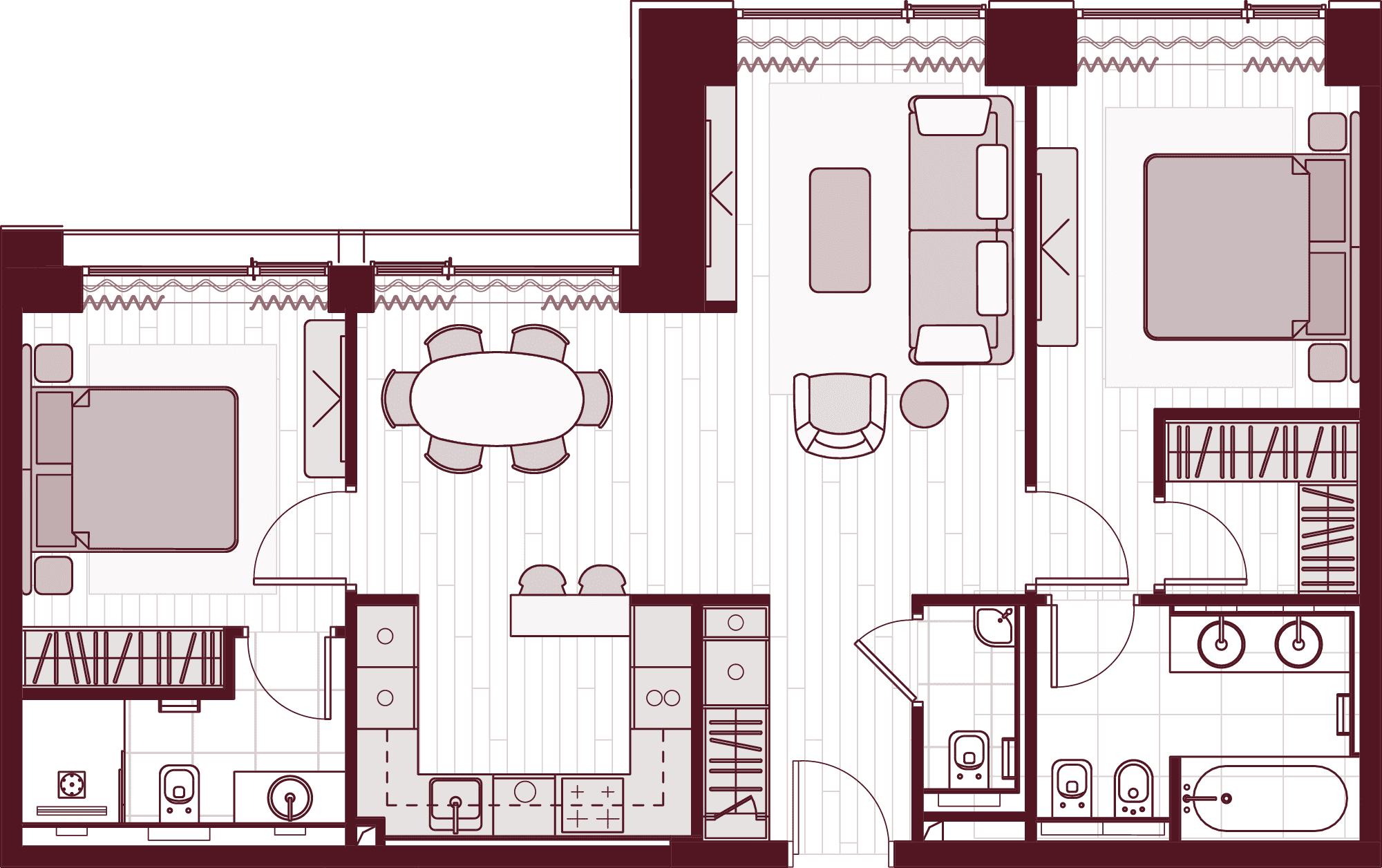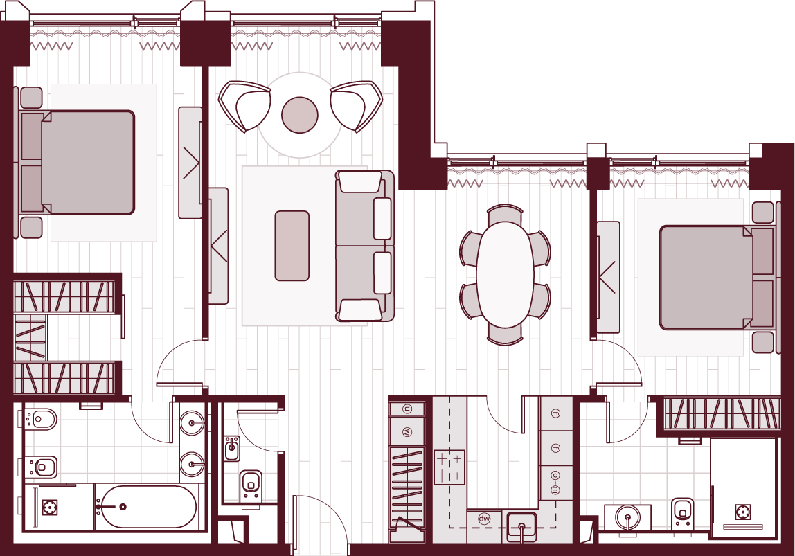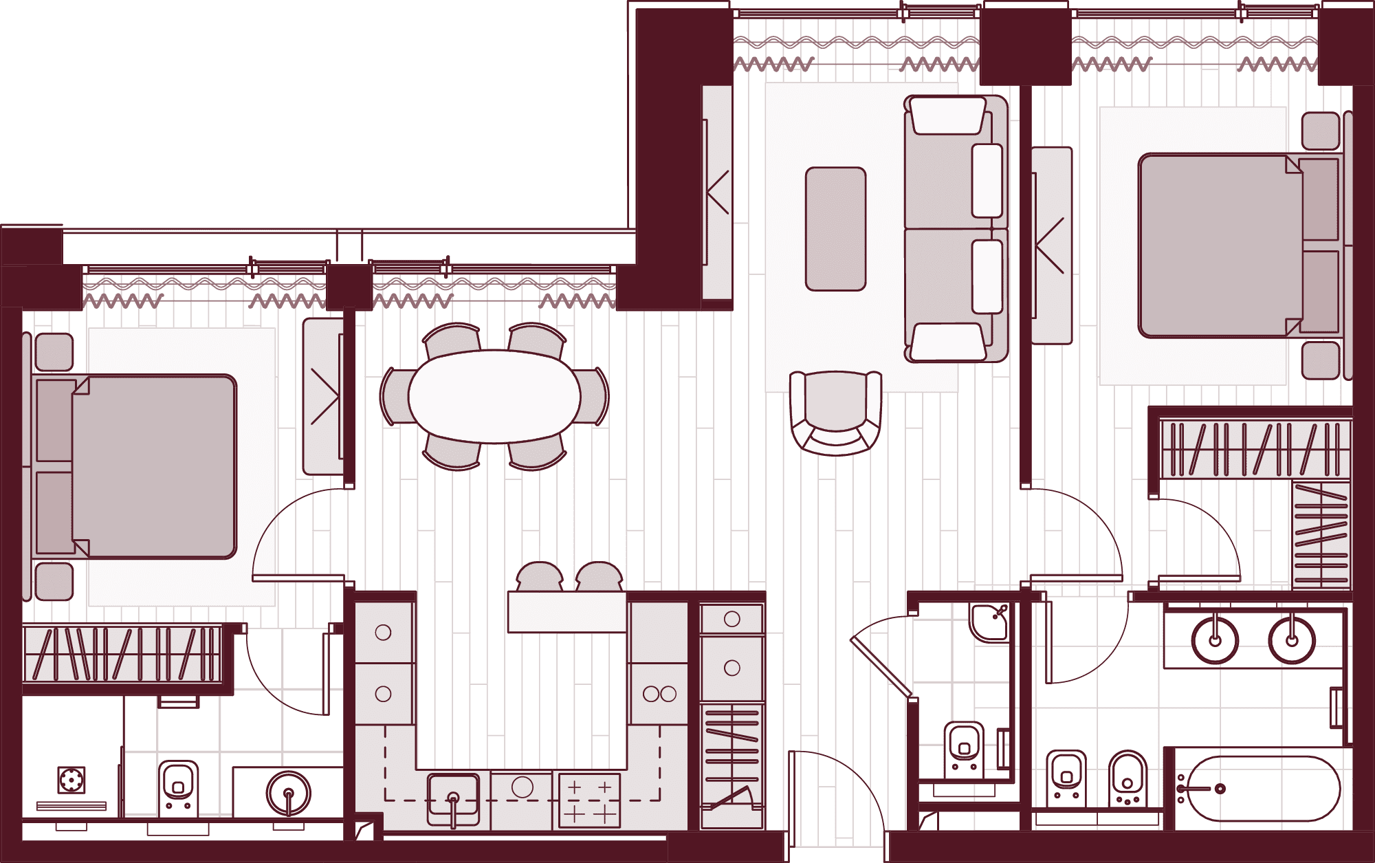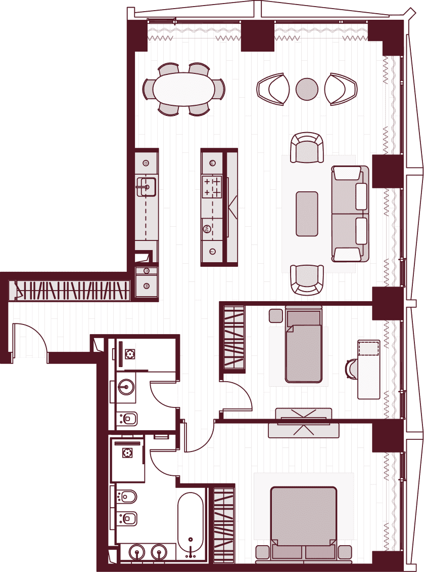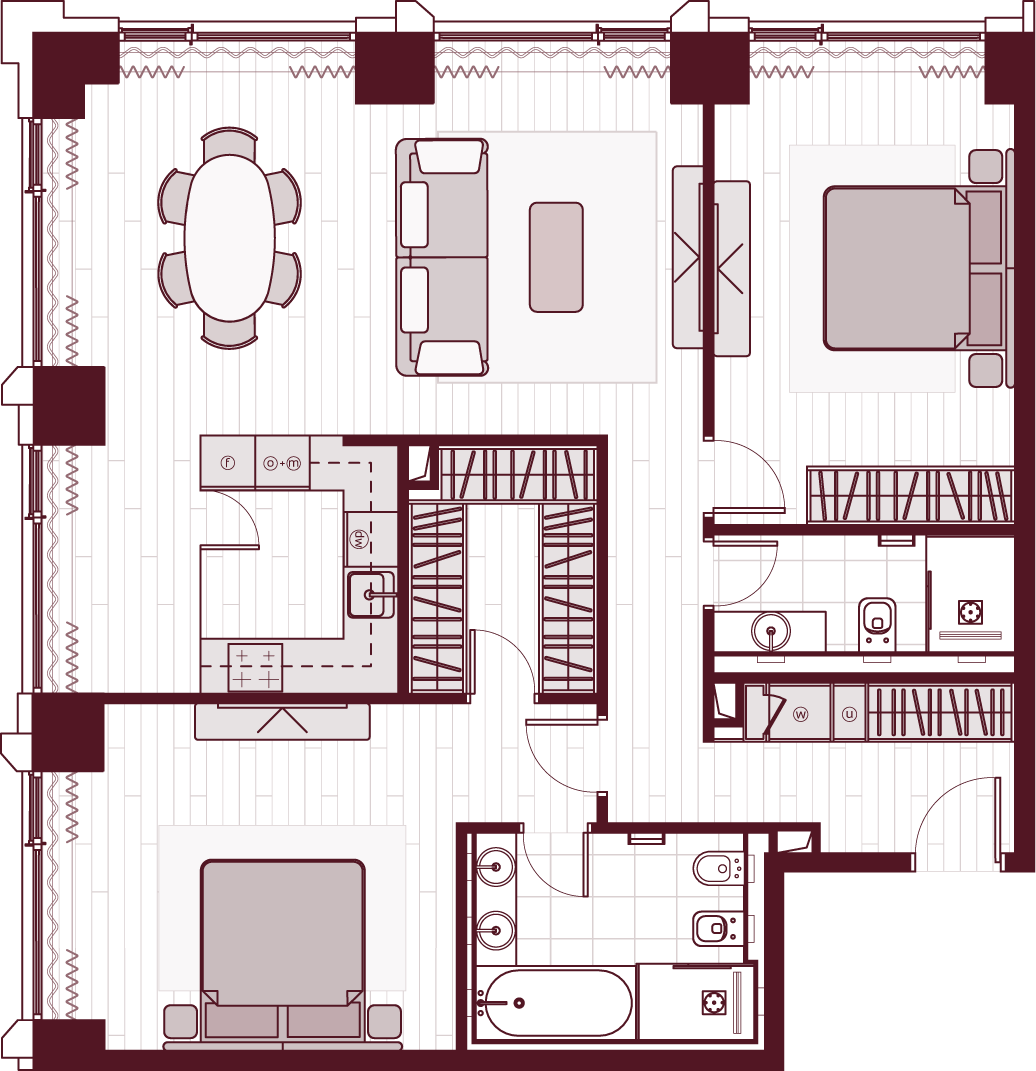 Более 80 вариантов планировочных решений от однокомнатных квартир до двухуровневых дуплексов и пентхаусов площадью от 40 до 398 м2. Панорамные окна, высокие потолки, мастер-спальни, балконы и террасы создают особенный комфорт и уют.