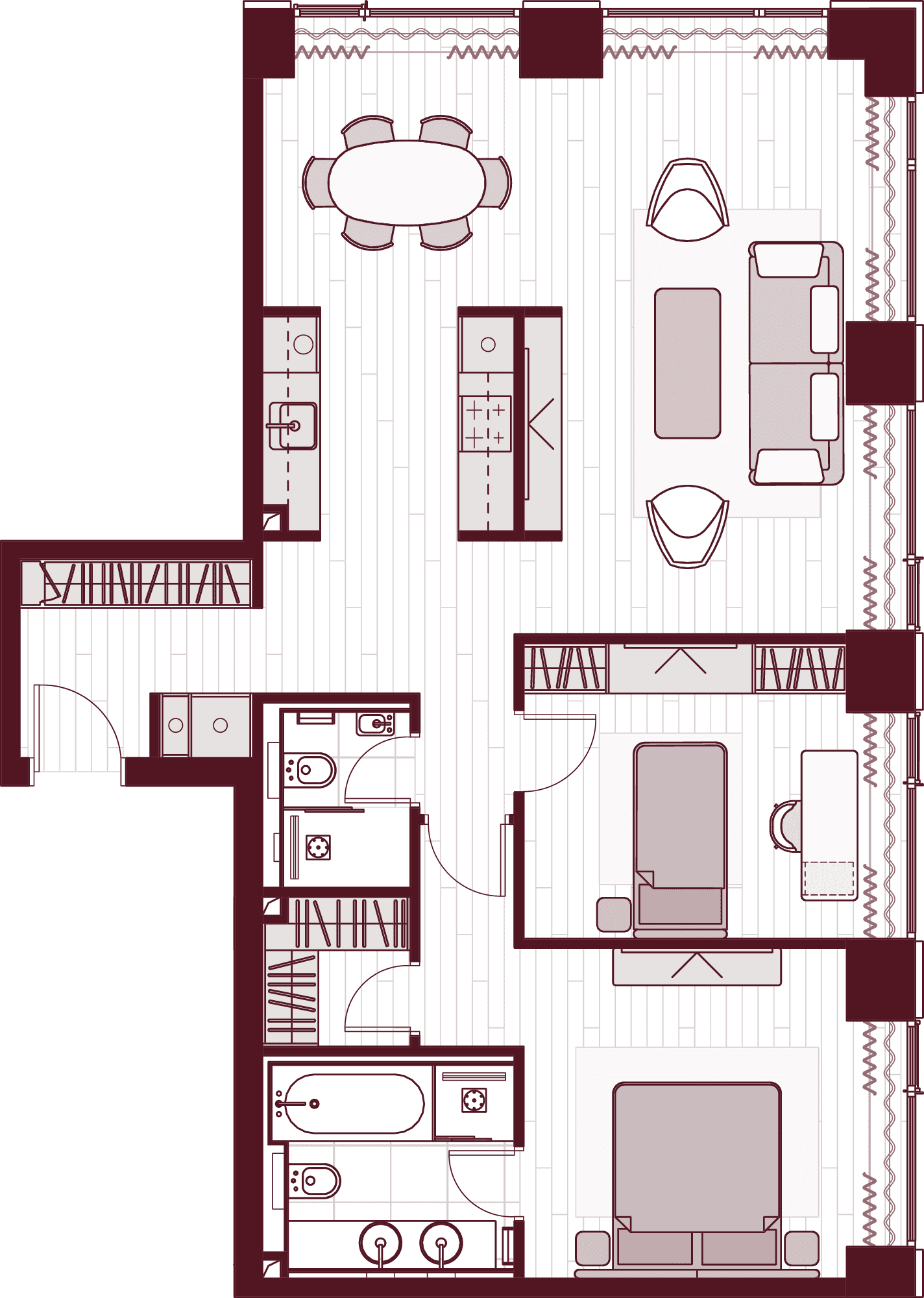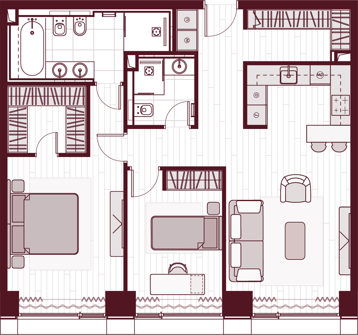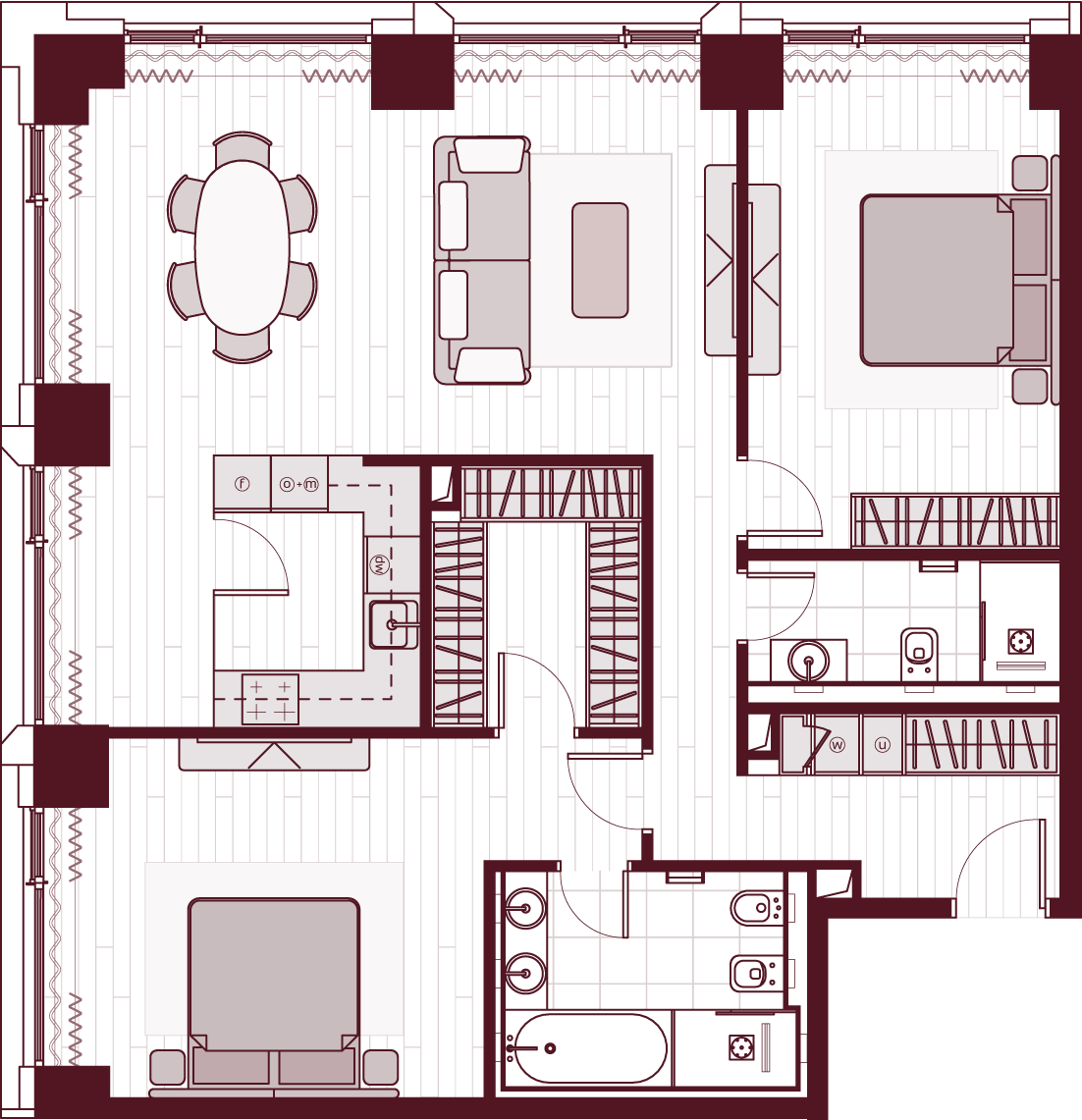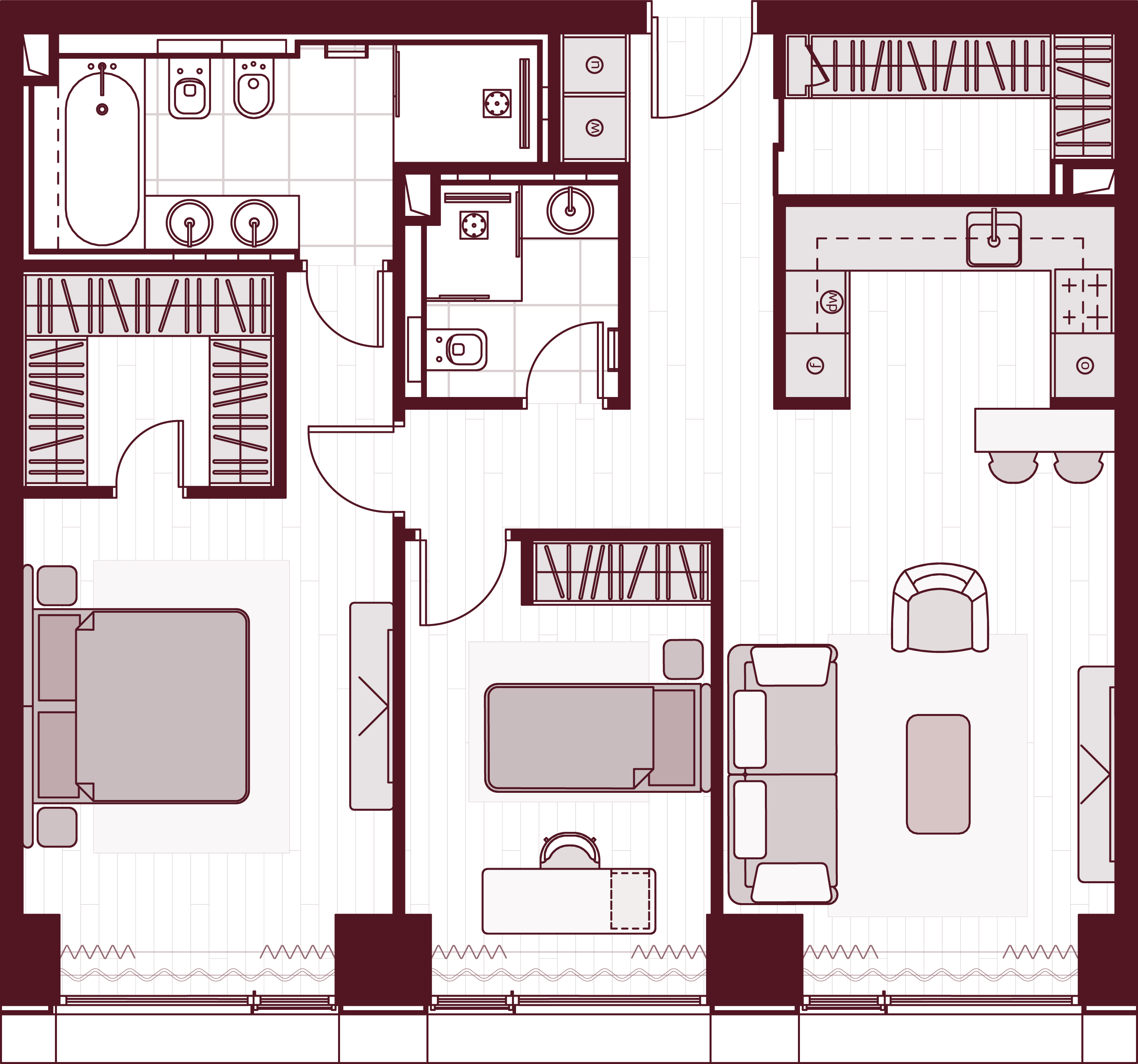 Более 80 вариантов планировочных решений от однокомнатных квартир до двухуровневых дуплексов и пентхаусов площадью от 40 до 398 м2. Панорамные окна, высокие потолки, мастер-спальни, балконы и террасы создают особенный комфорт и уют.