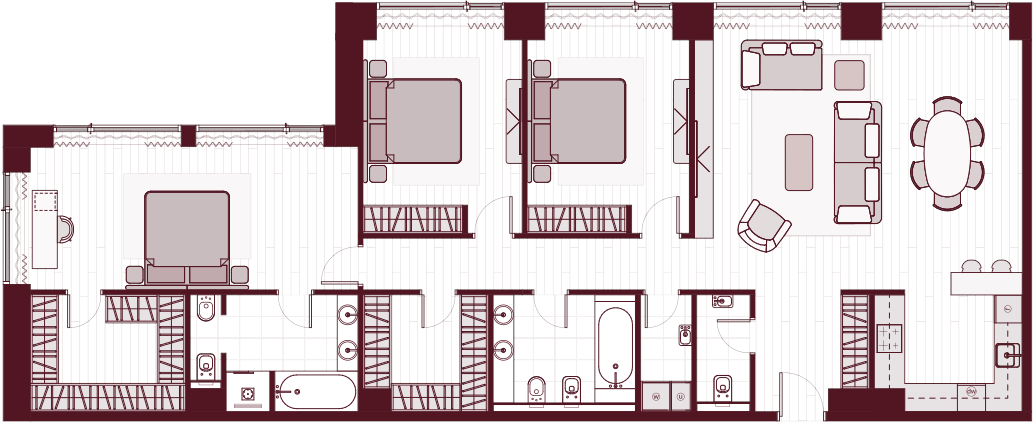 Более 80 вариантов планировочных решений от однокомнатных квартир до двухуровневых дуплексов и пентхаусов площадью от 40 до 398 м2. Панорамные окна, высокие потолки, мастер-спальни, балконы и террасы создают особенный комфорт и уют.