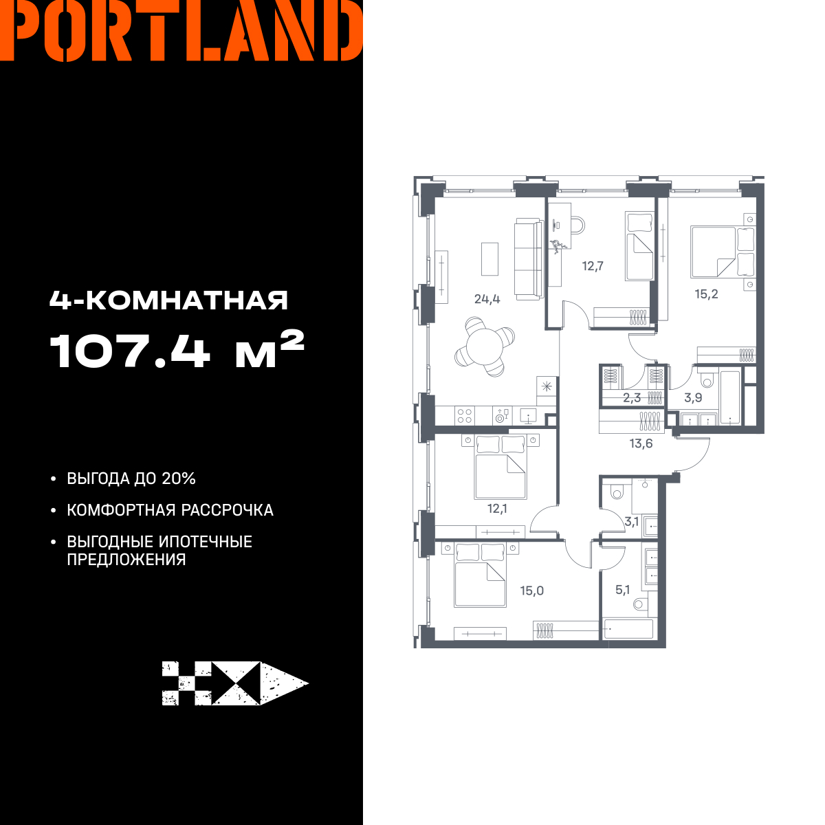 Евро четырехкомнатные квартиры в ЖК Portland (Портленд)