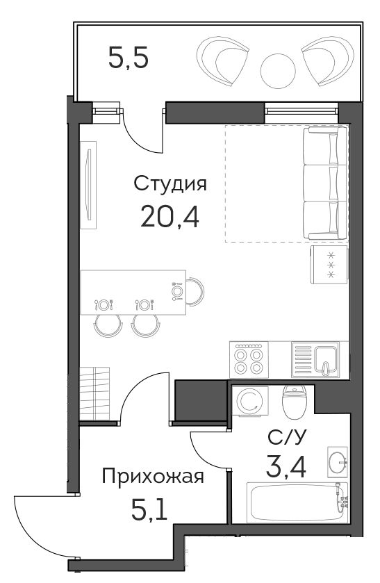 В комплексе насчитывается 1179 квартир, от компактных студий (26,6 кв. м) до четырехкомнатных квартир (81,3 кв. м). Высота потоков стандартная – 2,7 м, зато площадь балконов составляет не менее 3 кв. м, причем сдаются они уже с отделкой.