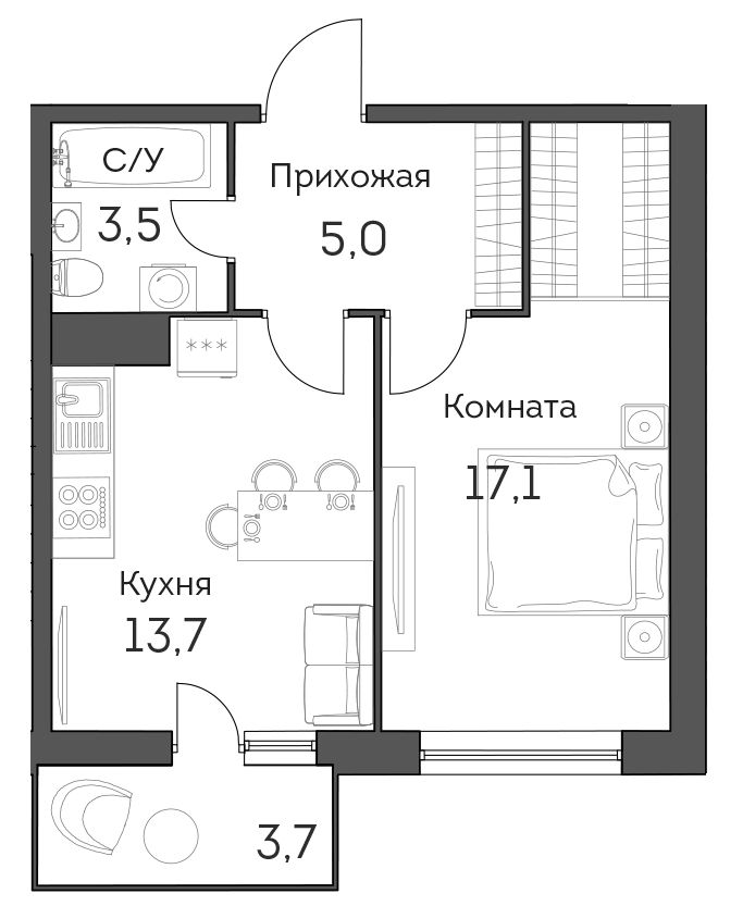 В комплексе насчитывается 1179 квартир, от компактных студий (26,6 кв. м) до четырехкомнатных квартир (81,3 кв. м). Высота потоков стандартная – 2,7 м, зато площадь балконов составляет не менее 3 кв. м, причем сдаются они уже с отделкой.