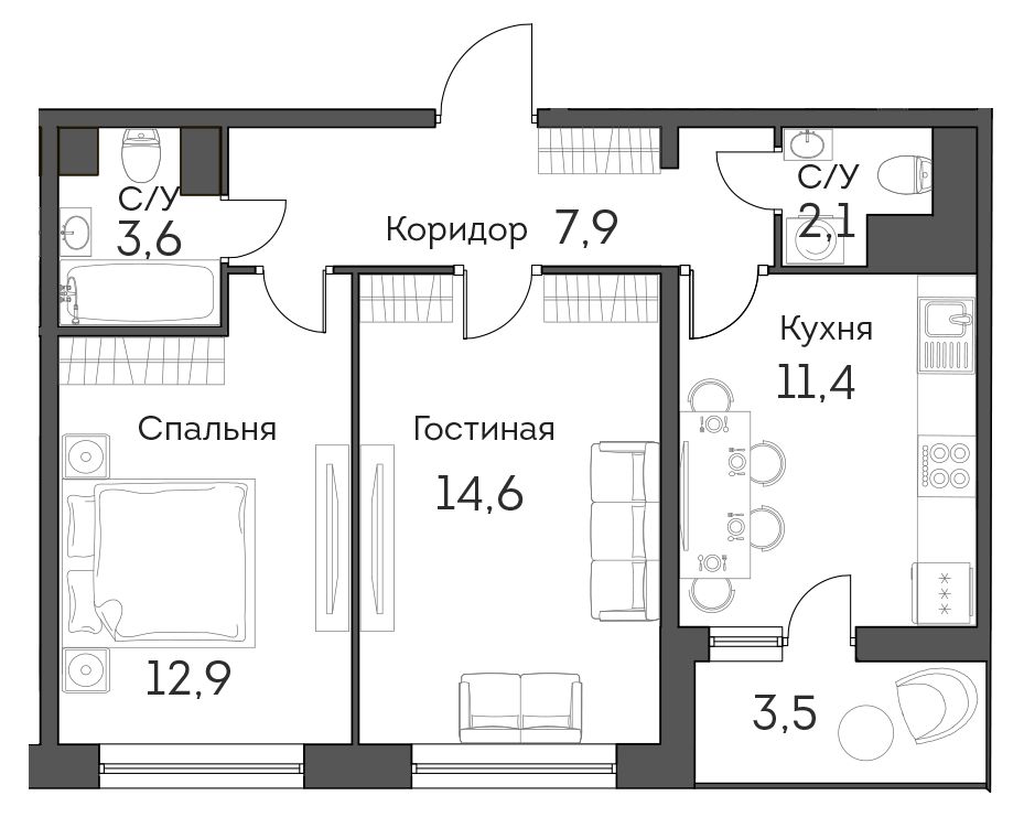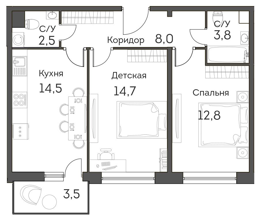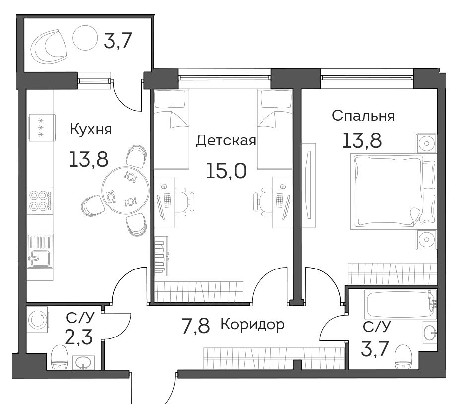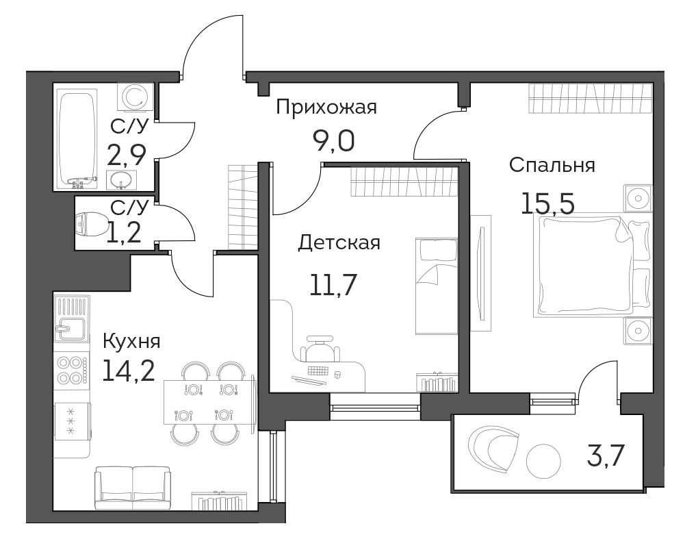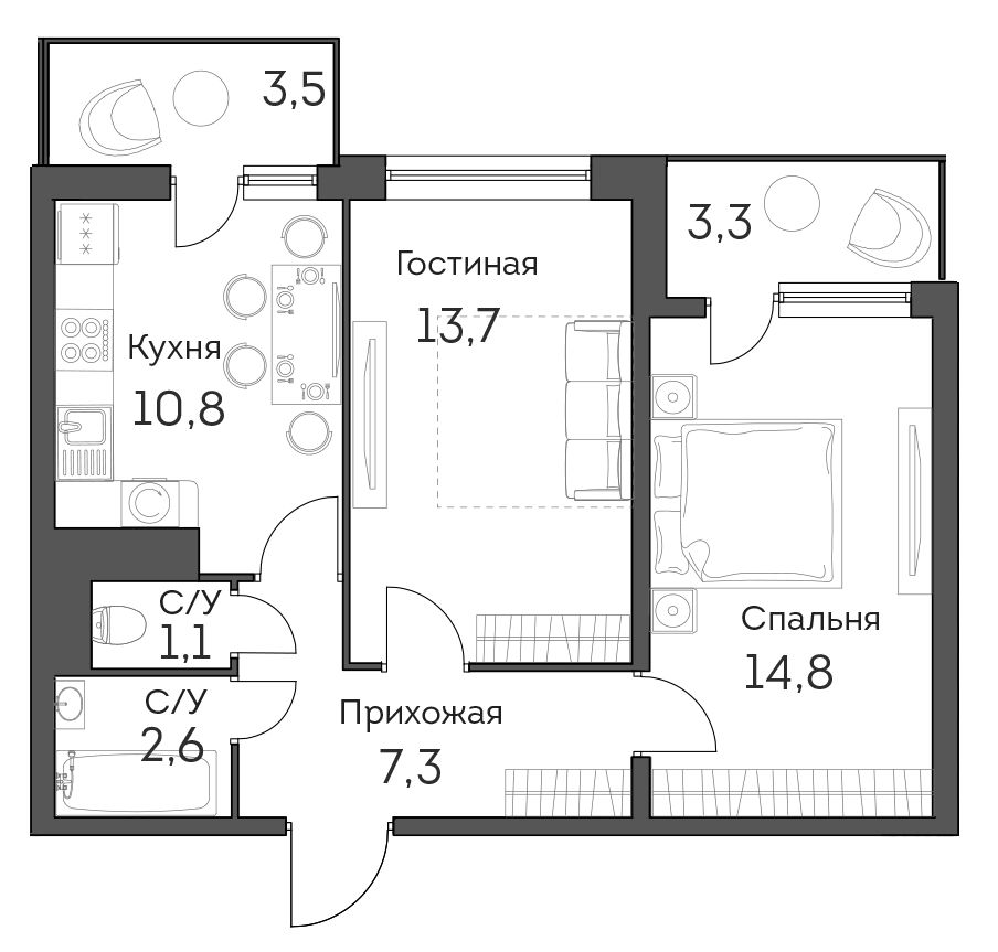 В комплексе насчитывается 1179 квартир, от компактных студий (26,6 кв. м) до четырехкомнатных квартир (81,3 кв. м). Высота потоков стандартная – 2,7 м, зато площадь балконов составляет не менее 3 кв. м, причем сдаются они уже с отделкой.