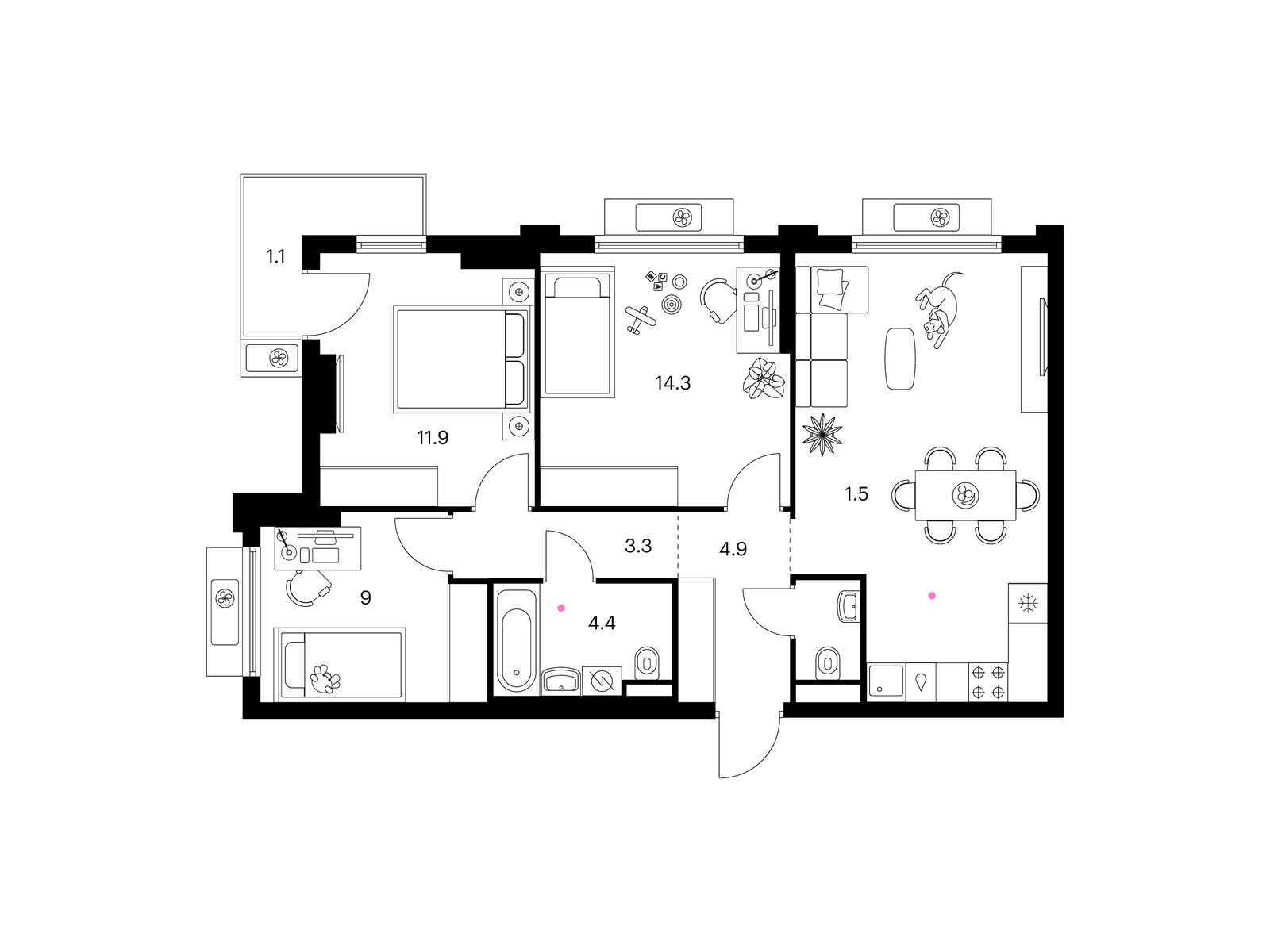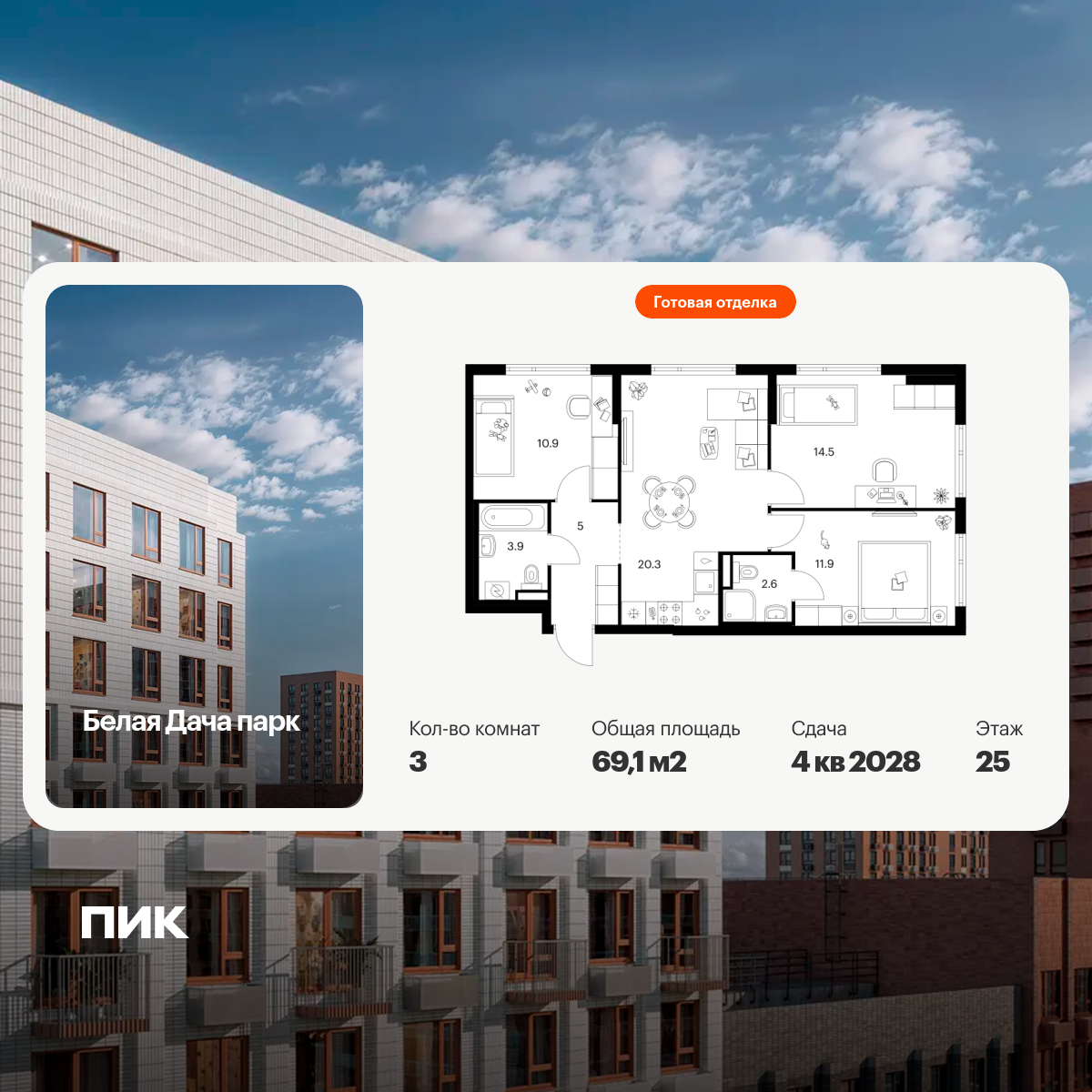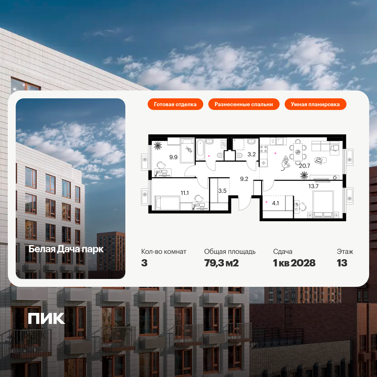 В проекте «Белая Дача парк» широкий выбор планировок для разных сценариев жизни. Есть квартиры с мастер-спальней, кухней-гостиной, гардеробной, постирочной и двумя санузлами. Большим семьям понравятся планировки, где спальни разнесены по разные стороны гостиной.