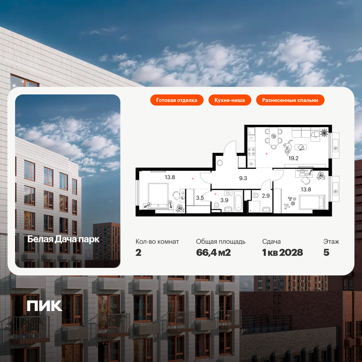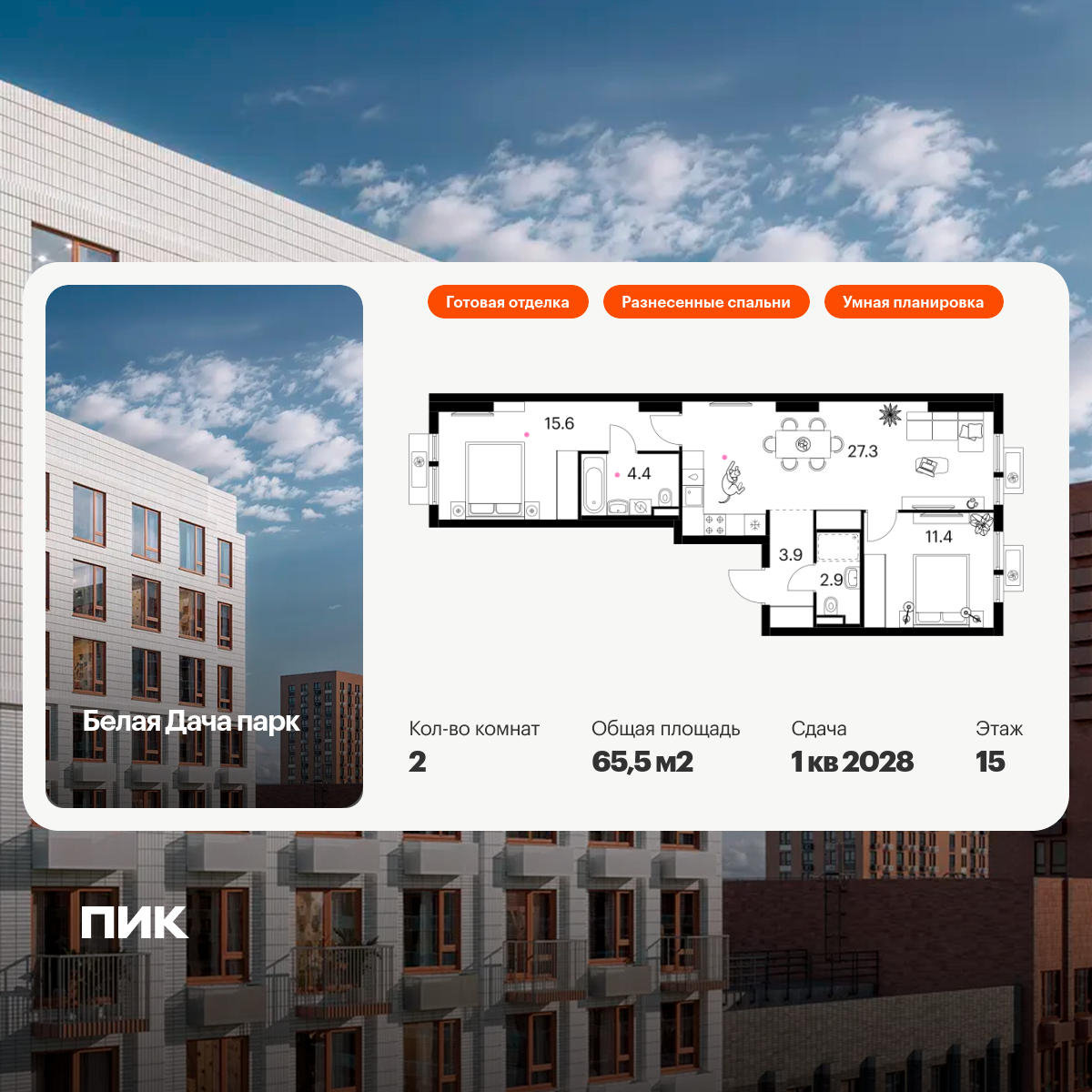 В проекте «Белая Дача парк» широкий выбор планировок для разных сценариев жизни. Есть квартиры с мастер-спальней, кухней-гостиной, гардеробной, постирочной и двумя санузлами. Большим семьям понравятся планировки, где спальни разнесены по разные стороны гостиной.