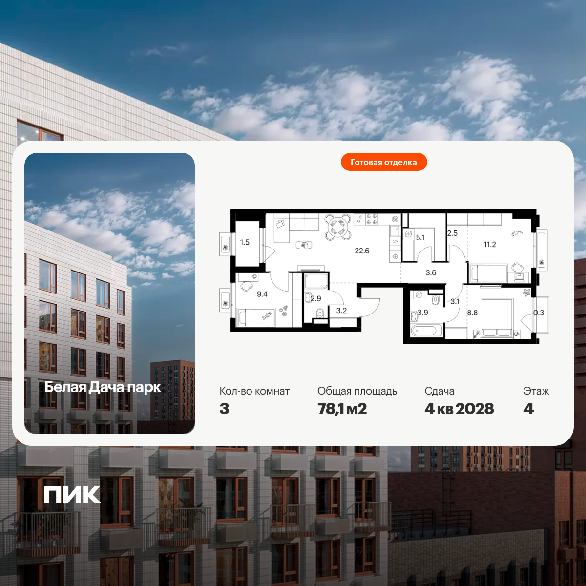 Евро трехкомнатные квартиры в Белая Дача Парк