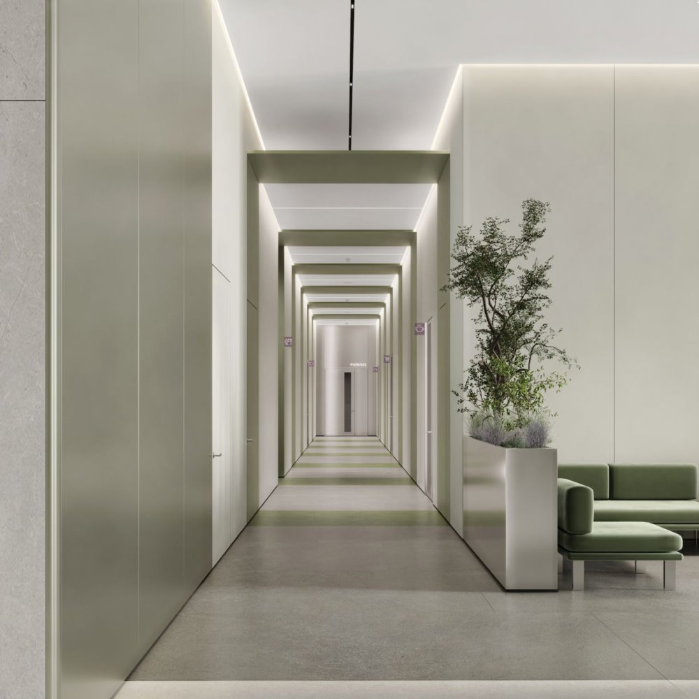 Опции, которые предлагает застройщик для проекта: наземная парковка, система бесконтактного доступа, видеонаблюдение, центральное кондиционирование, ресепшен.