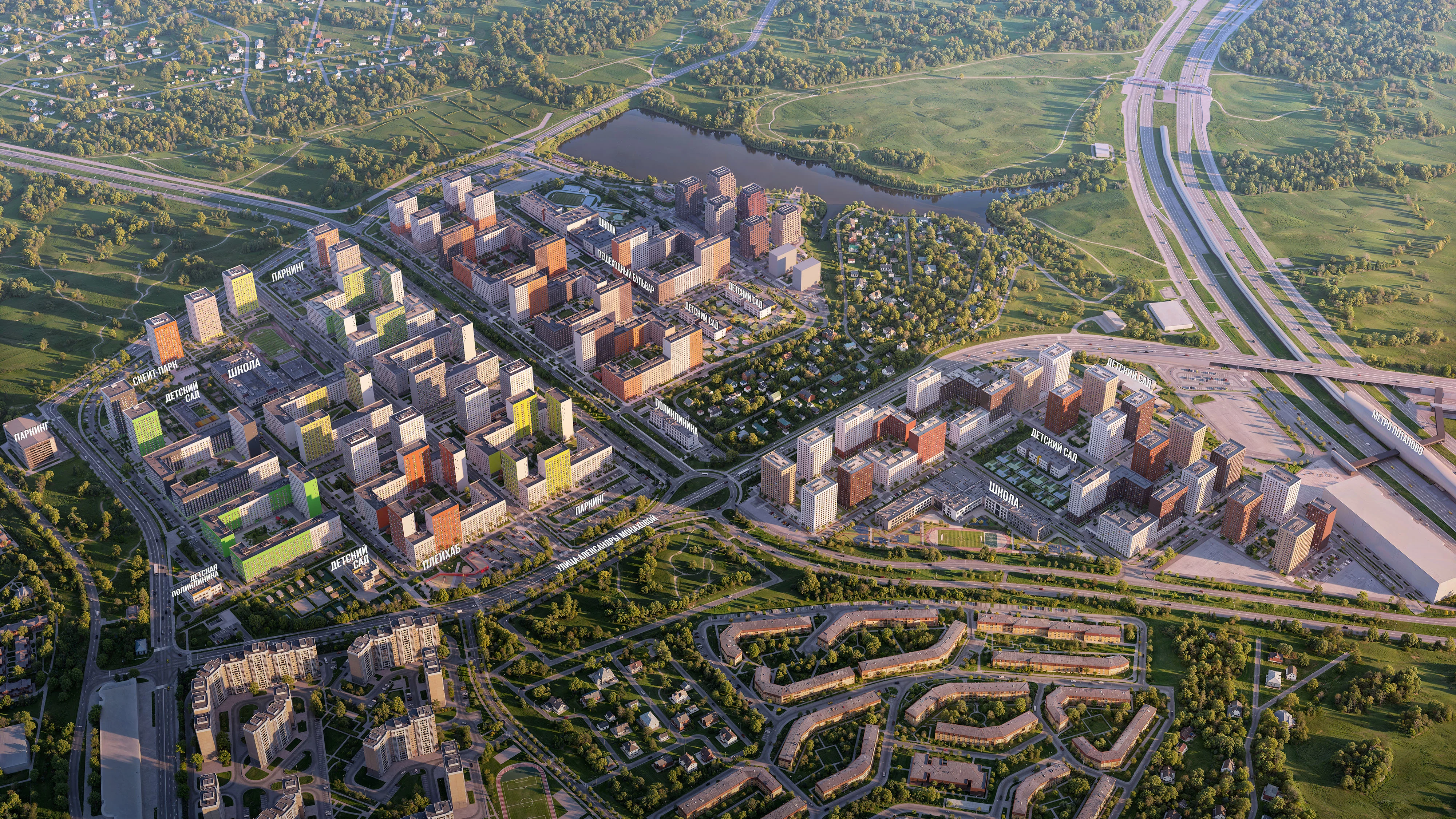 Рядом с домами находится ПлейХаб «Пирамиды» — игровое и творческое пространство для детей любых возрастов и их родителей. На его территории есть террасы, навесы, кафе, высокие открытые и закрытые горки, паутина, подземные тоннели и даже ручей с плотинами.