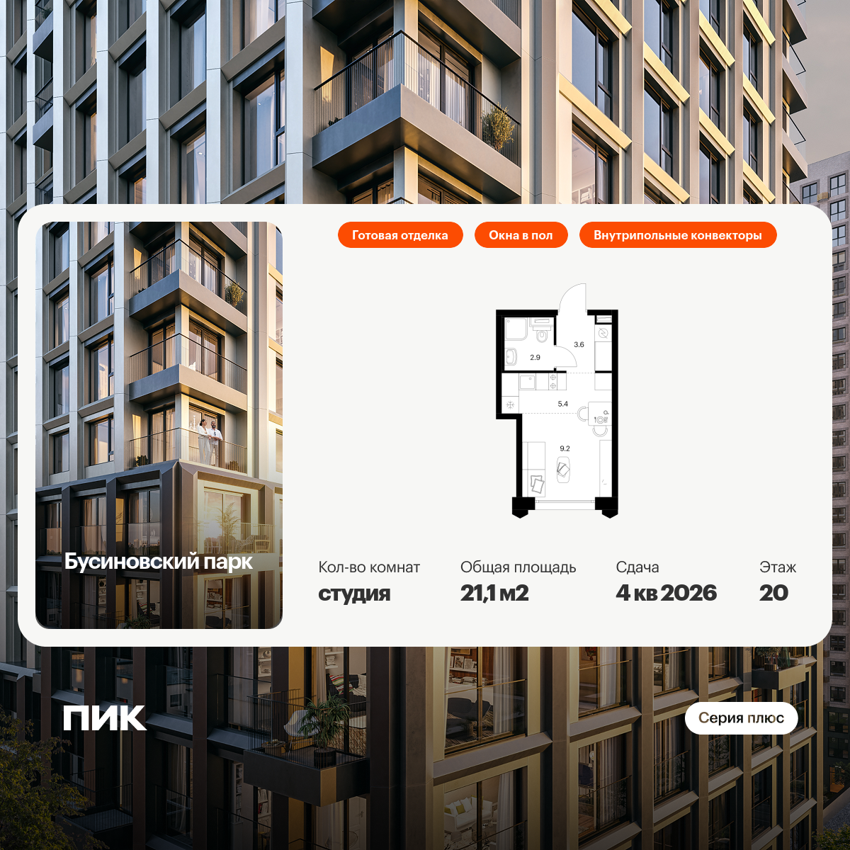 В «Бусиновском парке» предусмотрены квартиры с панорамным остеклением, различными балконами, эркерами, угловыми окнами и большим количеством окон — до пяти в одной комнате. В таких квартирах широкий угол обзора: можно пить кофе, наблюдая за жизнью на улице и наслаждаясь ощущением простора. Ещё больше комфорта придаст мягкий солнечный свет, который равномерно осветит всю квартиру.