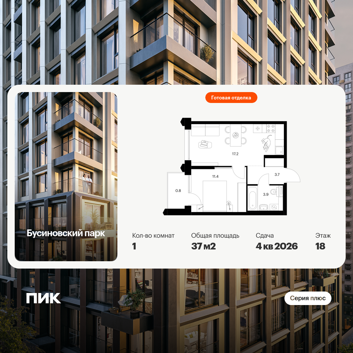 В «Бусиновском парке» широкий выбор квартир уникальных форматов. Есть планировки с эркерами, различными балконами, панорамными и угловыми окнами, а также квартиры с большим количеством окон — до 5 в одной комнате. На верхних этажах корпуса 1.4 есть планировки с большими террасами площадью от 29 до 55 м². В проекте можно выбрать квартиру с готовой отделкой.