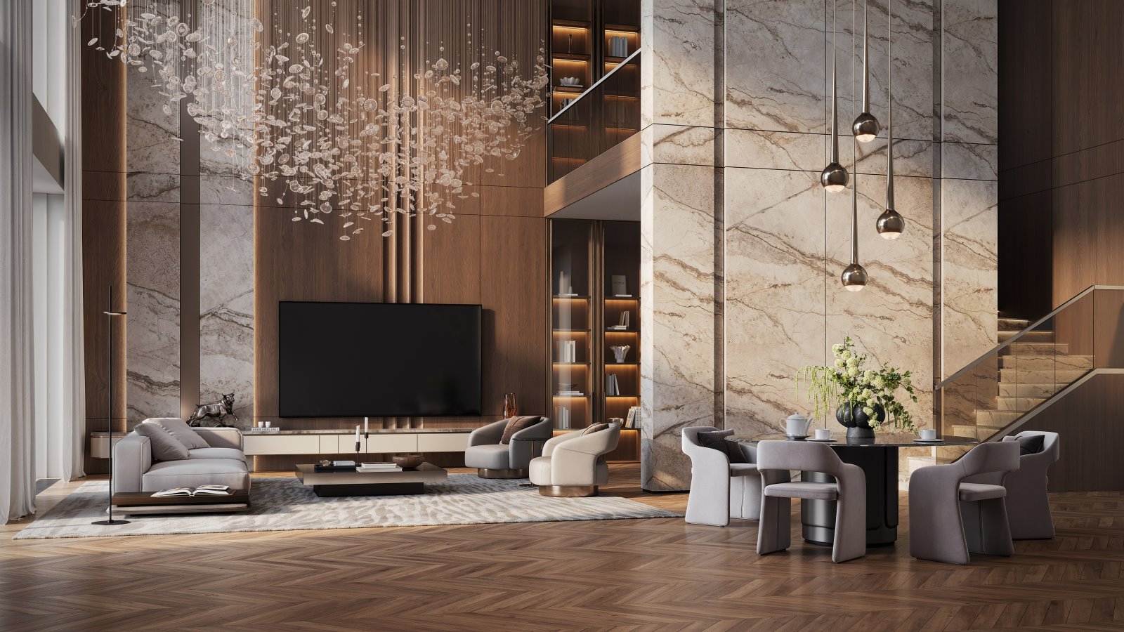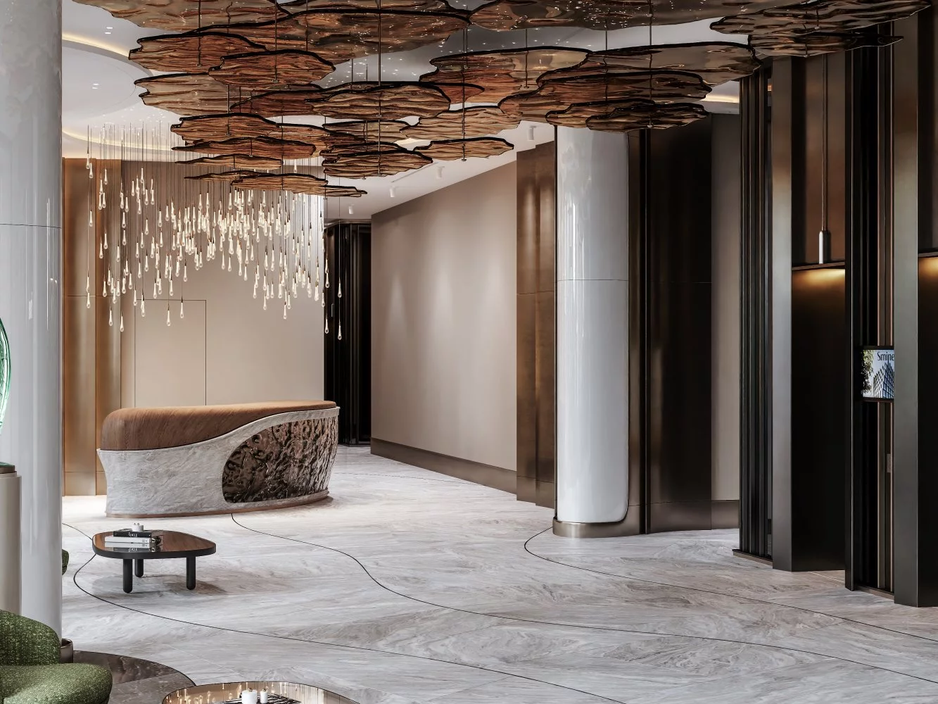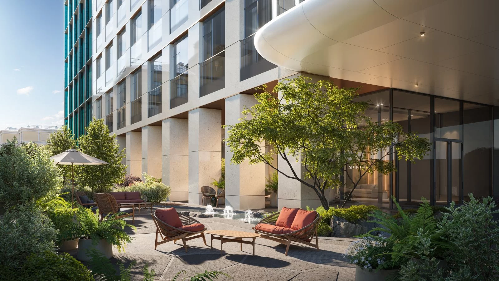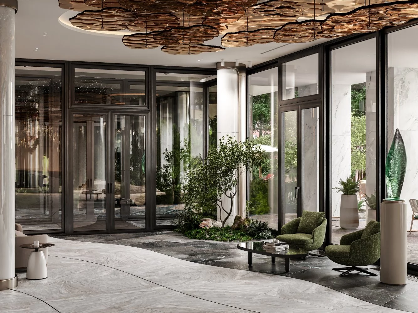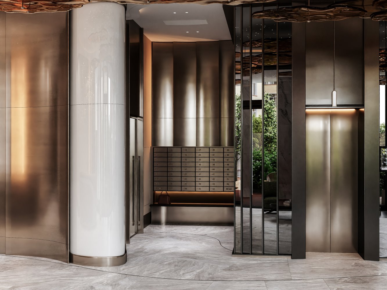 Зелёный двор, вымощенный натуральным камнем с цветной инкрустацией из стекла и керамики, плавно перетекает в интерьеры приватного лобби. В летнее время витражи во всю стену открываются, стирая грань между внутренним и уличным пространствами. Дорогая отделка из латуни, стекла и мрамора в карамельных, шоколадных и янтарных оттенках создаёт изысканную атмосферу. Для комфорта резидентов в лобби расположены колясочная и гостевой санузел.