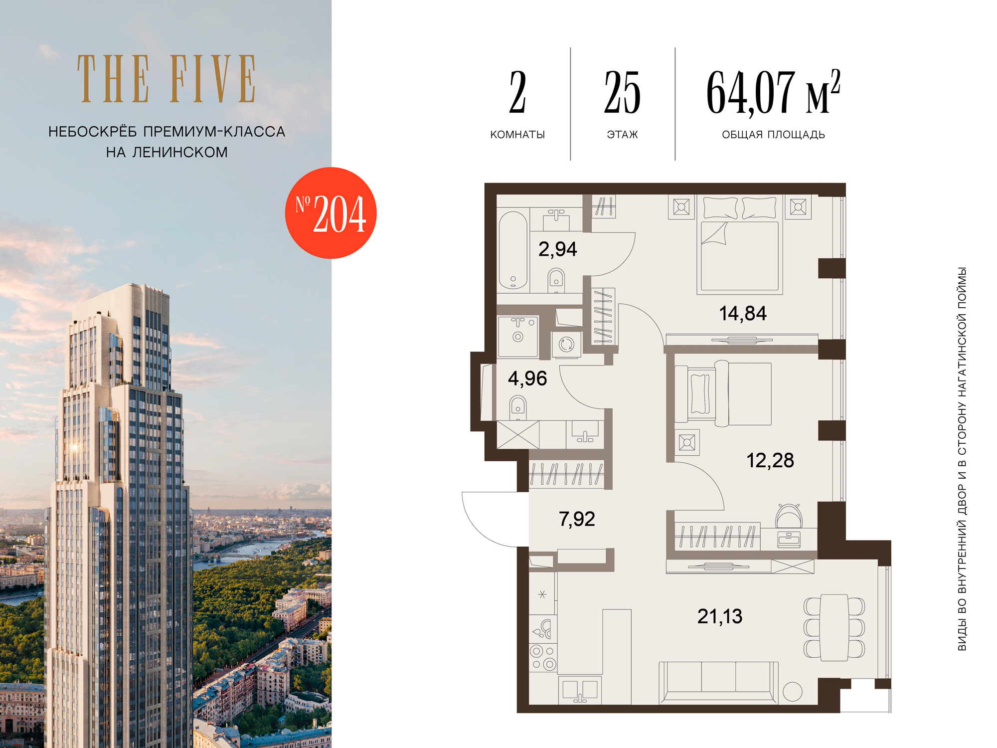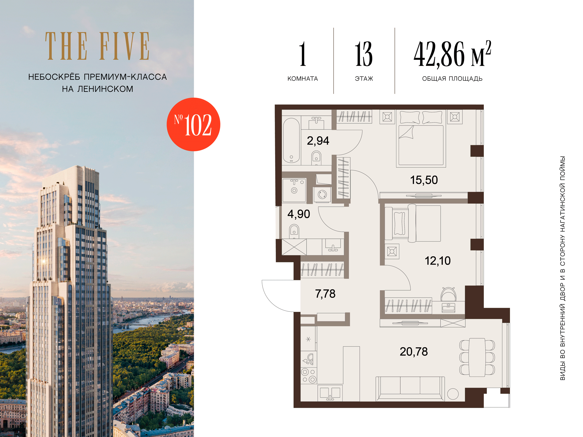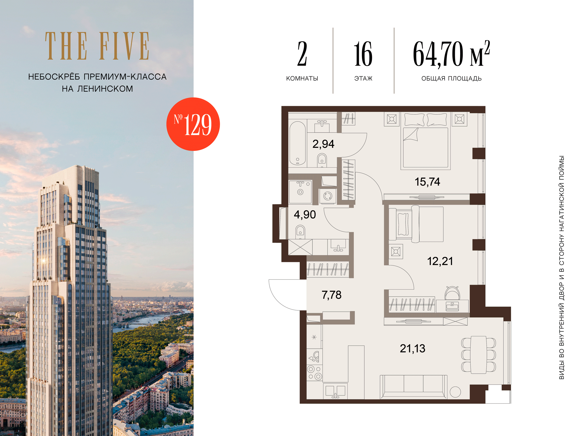 Из роскошных резиденций комплекса открываются фантастические виды на исторический центр Москвы, зелёные парки и знаковые достопримечательности столицы. Эксклюзивные квартиры с террасами запланированы на 3, 49, 63 и 71 этажах небоскрёба. В FIVE TOWERS представлено такое редкое планировочное решение как гостиная с панорамными стенами и потолком.
