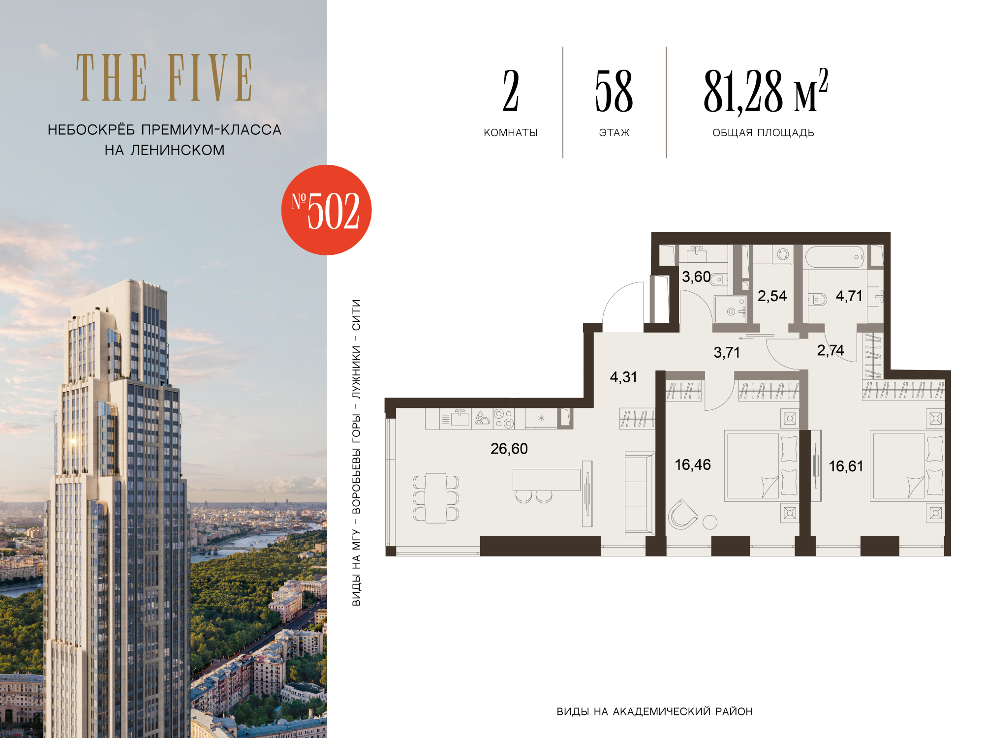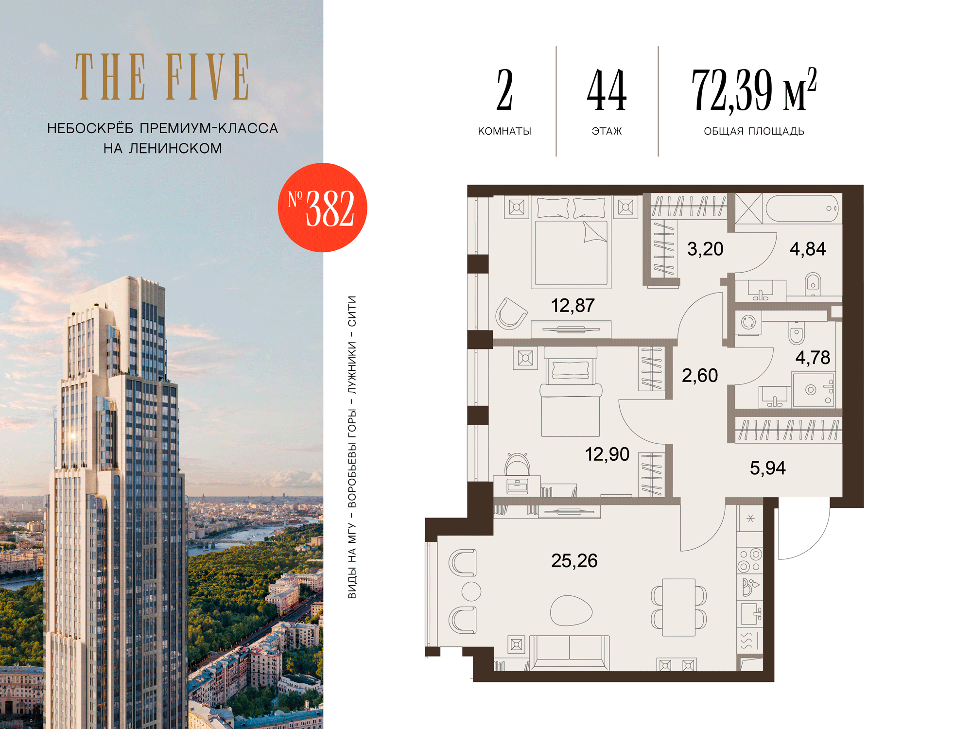 FIVE TOWERS — первый жилой небоскрёб на Ленинском проспекте и самое высокое здание столицы за пределами делового кластера «Москва-Сити». FIVE TOWERS станет одной из главных высотных доминант столицы. 75-этажный жилой комплекс премиум-класса изменит не только облик Донского района, но и всей центральной части города. FIVE TOWERS поражает воображение уникальными видами, монументальной роскошью и совершенством форм. Величественная панорама, открывающаяся из окон вашей квартиры, завораживает: легендарные сталинские высотки, шпиль главного корпуса МГУ им. М. В. Ломоносова, башни Российской академии наук, «Москва-Сити», спорткомплекс «Лужники», новый кампус «Яндекса». В шаговой доступности — 500 га парков, образуемых Музеоном, Парком Горького и парком «Воробьевы горы».
