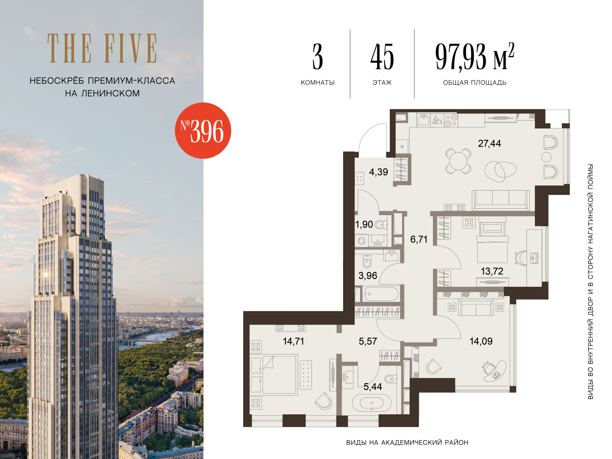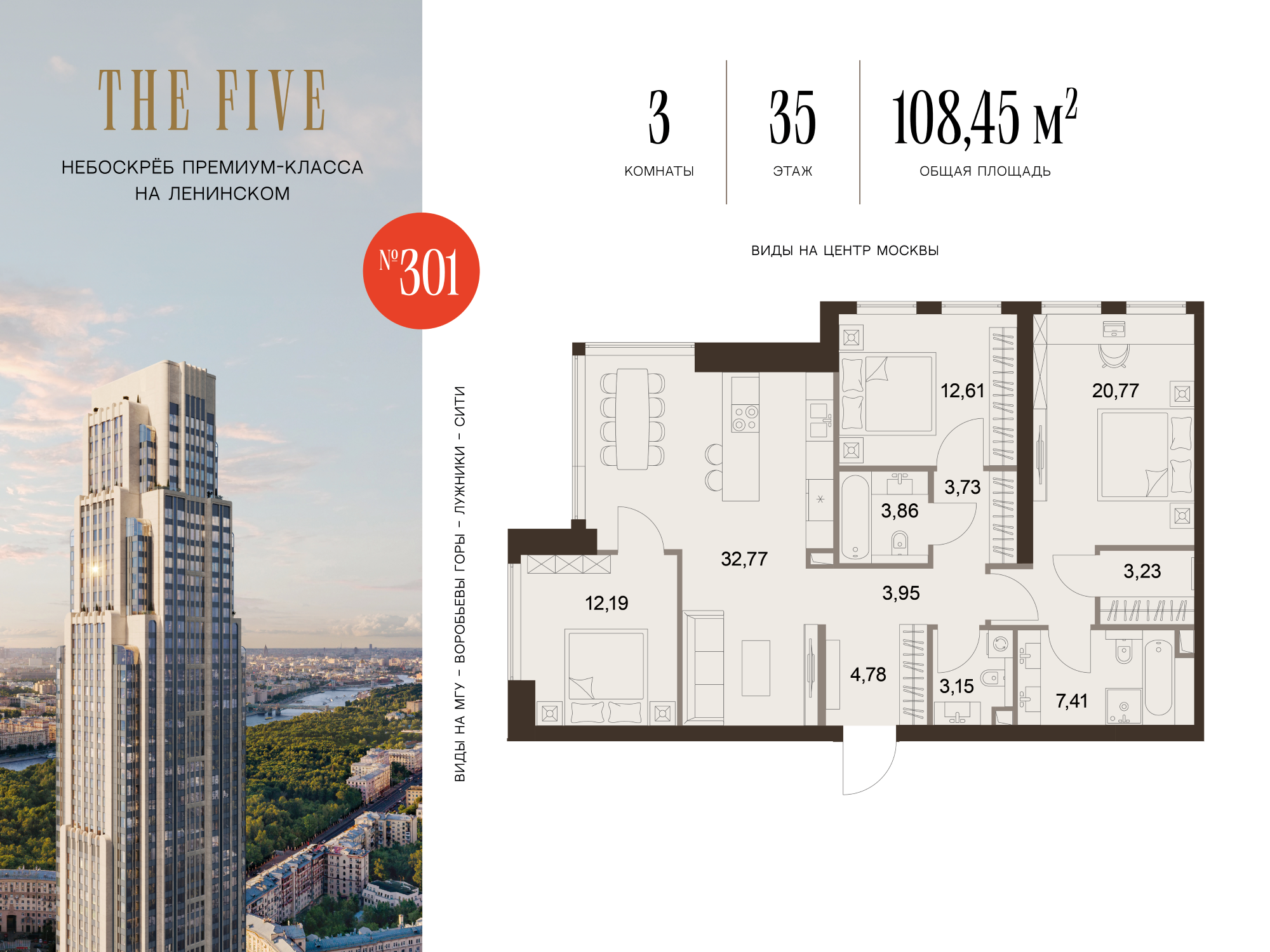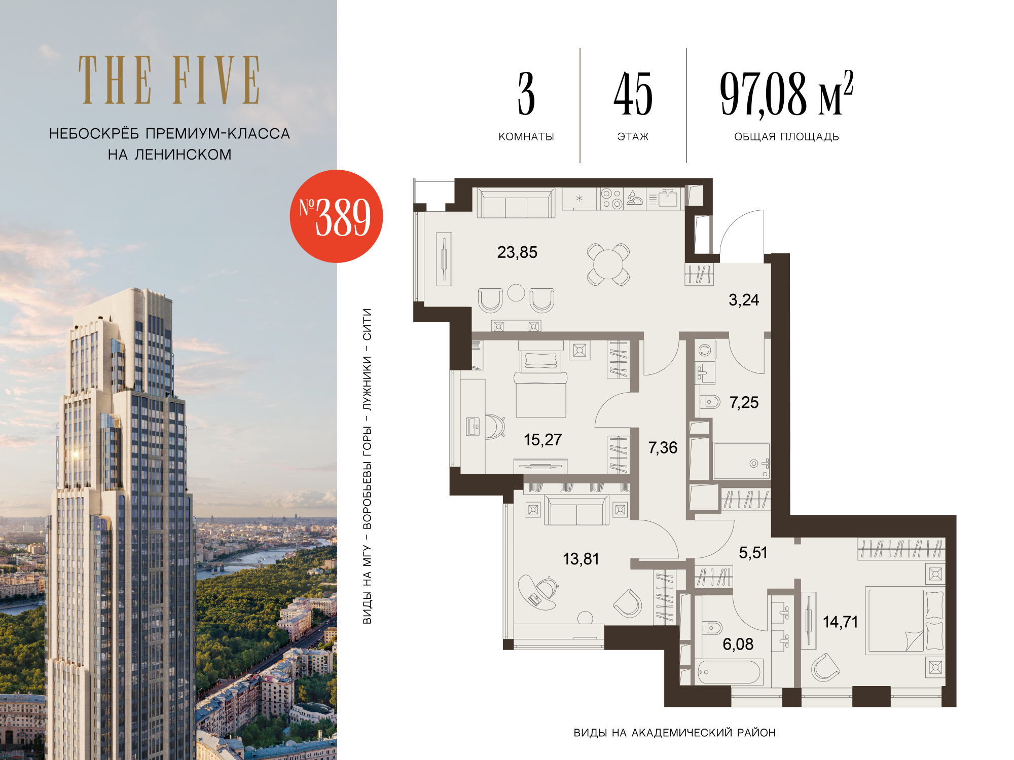 Из роскошных резиденций комплекса открываются фантастические виды на исторический центр Москвы, зелёные парки и знаковые достопримечательности столицы. Эксклюзивные квартиры с террасами запланированы на 3, 49, 63 и 71 этажах небоскрёба. В FIVE TOWERS представлено такое редкое планировочное решение как гостиная с панорамными стенами и потолком.