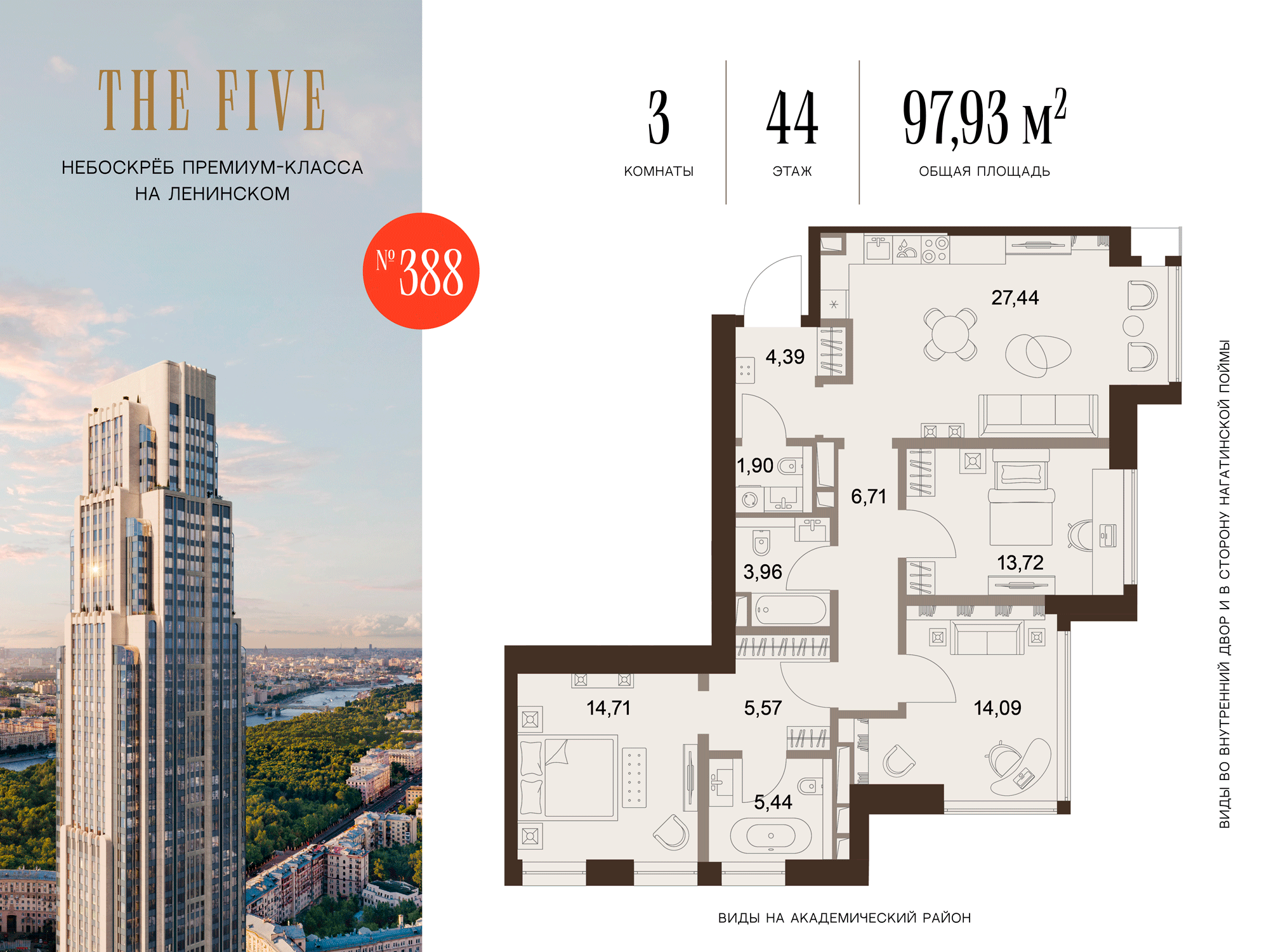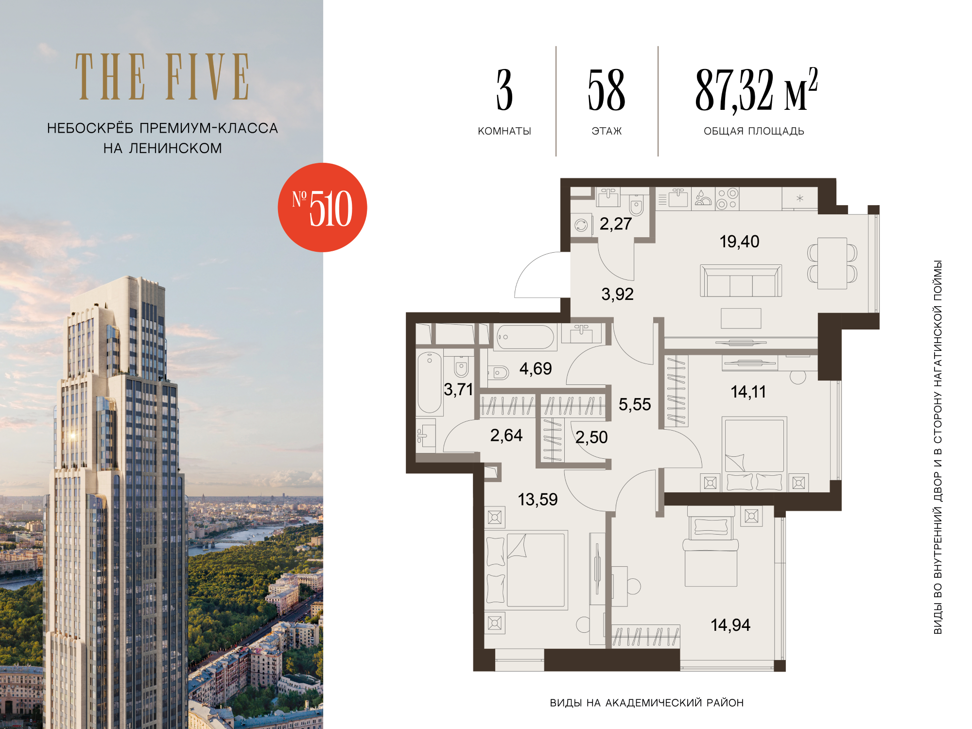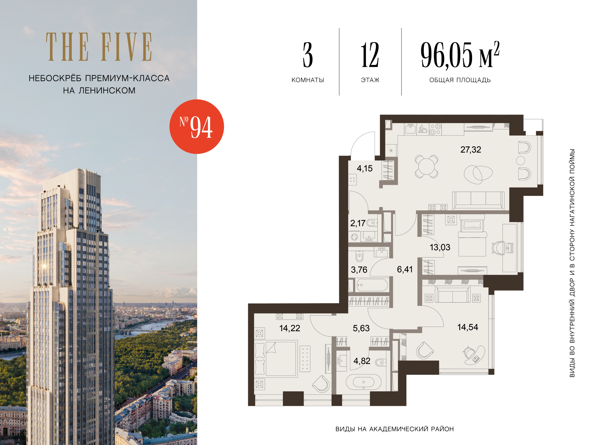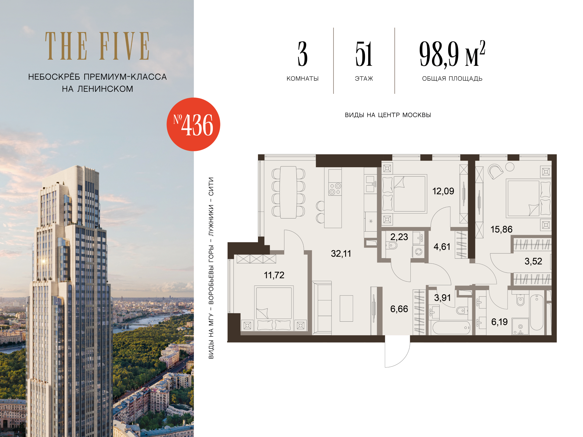 Из роскошных резиденций комплекса открываются фантастические виды на исторический центр Москвы, зелёные парки и знаковые достопримечательности столицы. Эксклюзивные квартиры с террасами запланированы на 3, 49, 63 и 71 этажах небоскрёба. В FIVE TOWERS представлено такое редкое планировочное решение как гостиная с панорамными стенами и потолком.