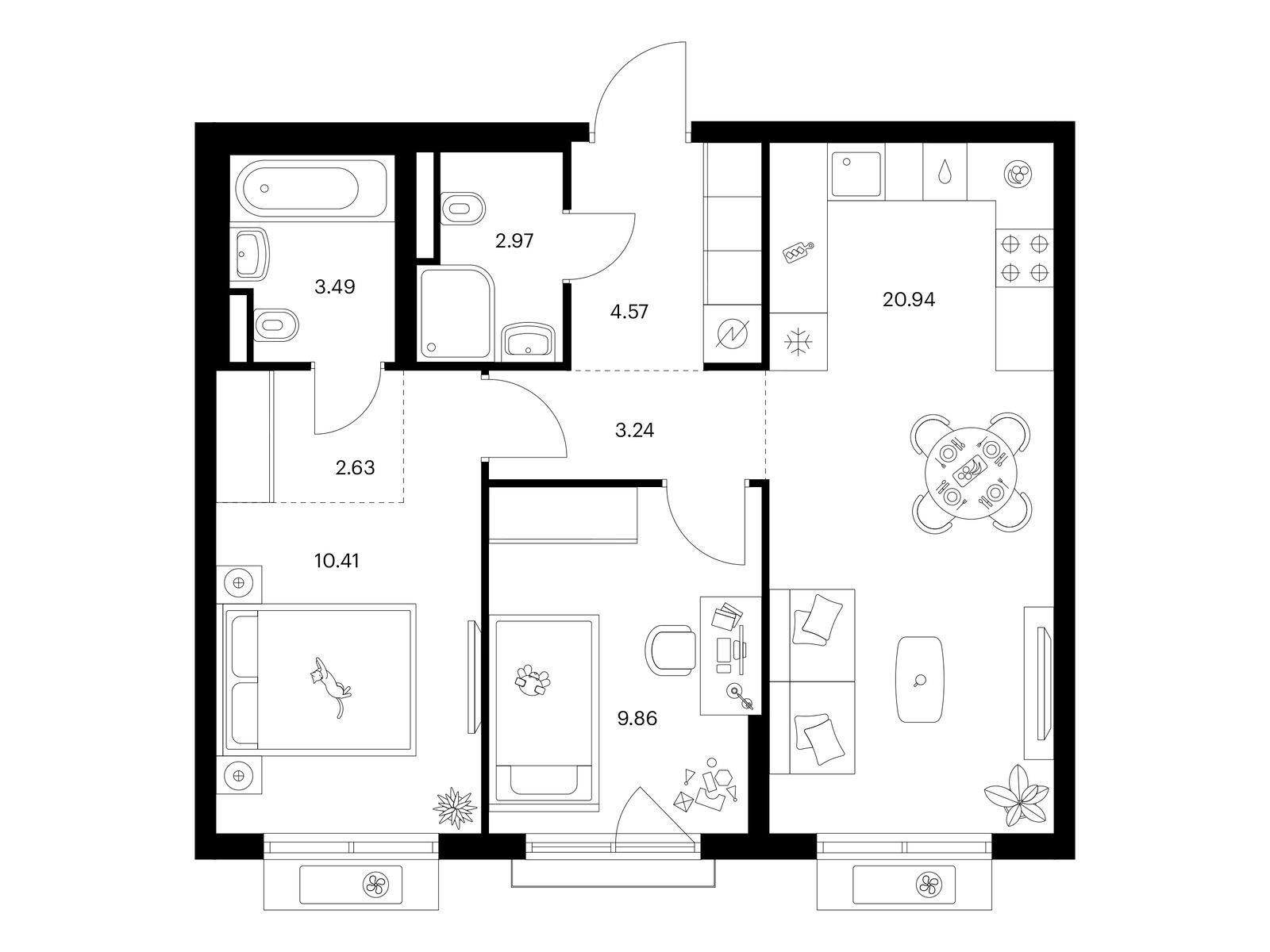 В квартирах продуман каждый метр — мы детально просчитываем все возможные сценарии и способы использовать пространство. Например, большой семье подойдёт квартира с кухней-гостиной, выделенной постирочной и спальнями, разнесёнными по разные стороны гостиной. А кому-то важнее просторная мастер-спальня с гардеробной и собственным санузлом.