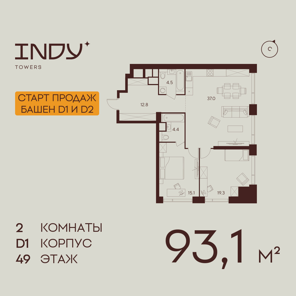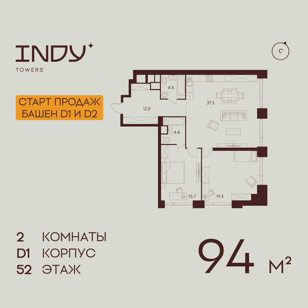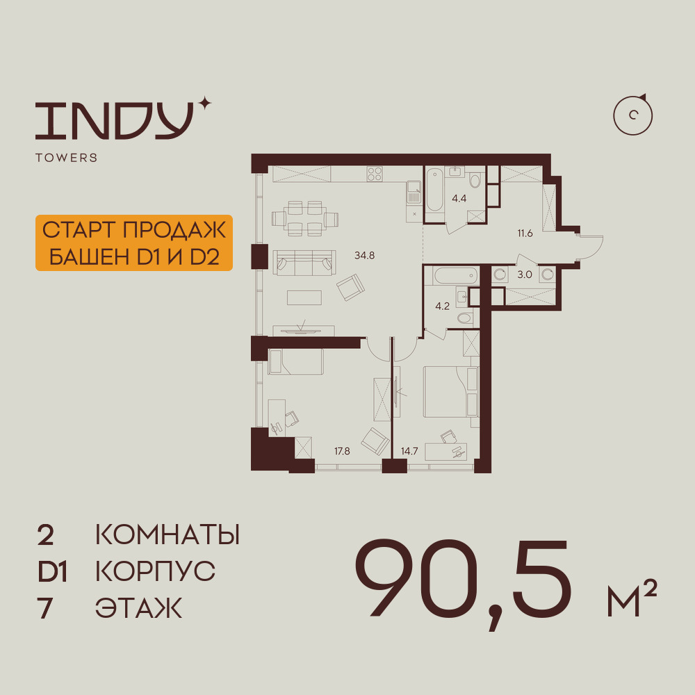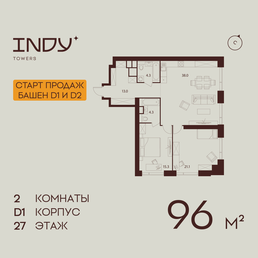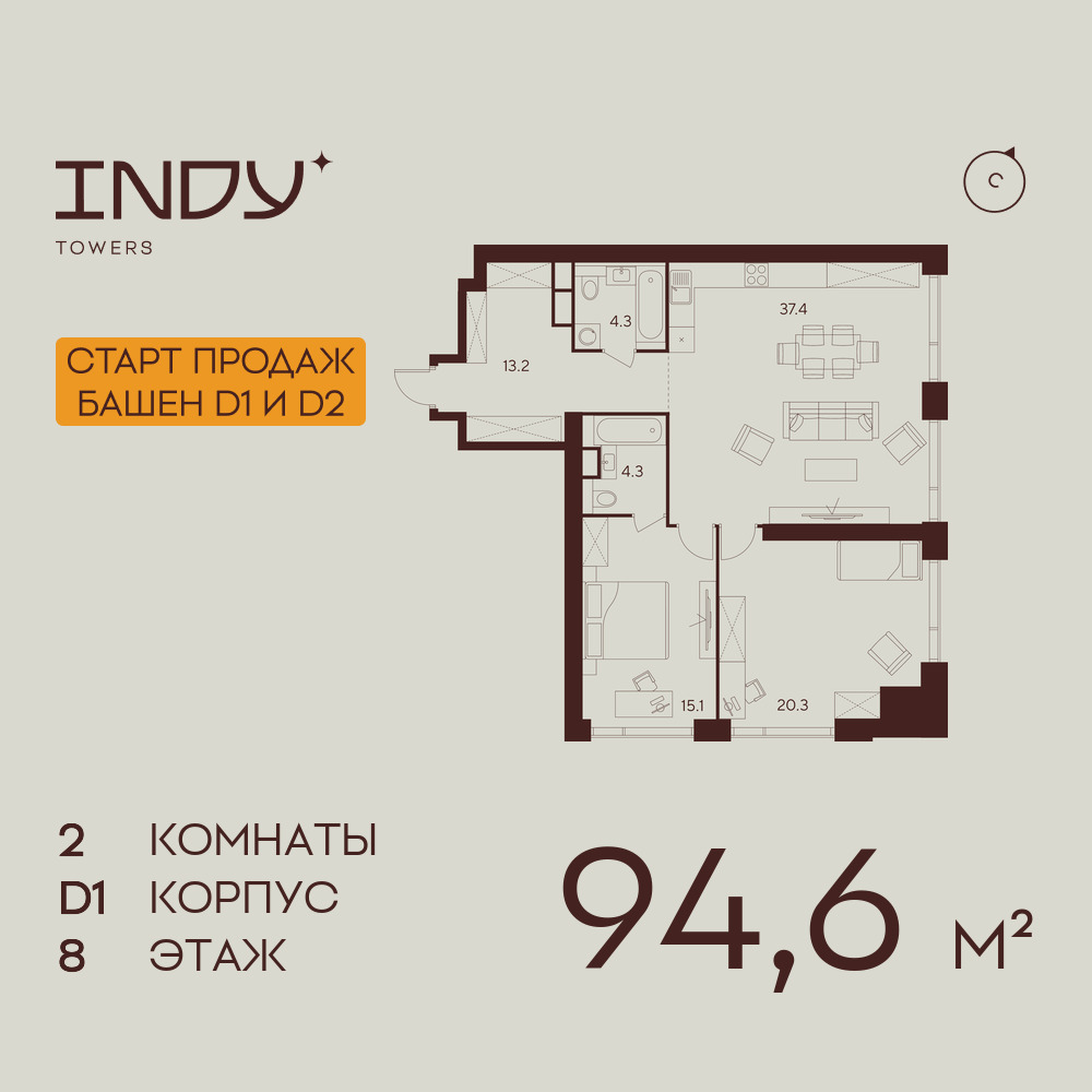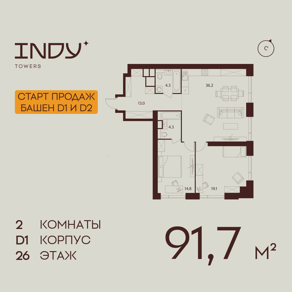 Евро двухкомнатные квартиры в ЖК INDY TOWERS (Инди Тауэрз)