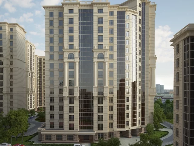 Комплекс состоит из четырех монолитно-кирпичных зданий в неоклассическом архитектурном стиле с эффектной дизайнерской отделкой и различными декоративными элементами. Вентилируемые фасады отделаны керамогранитной плиткой светлых оттенков. Высота секций составляет 8-18 этажей.