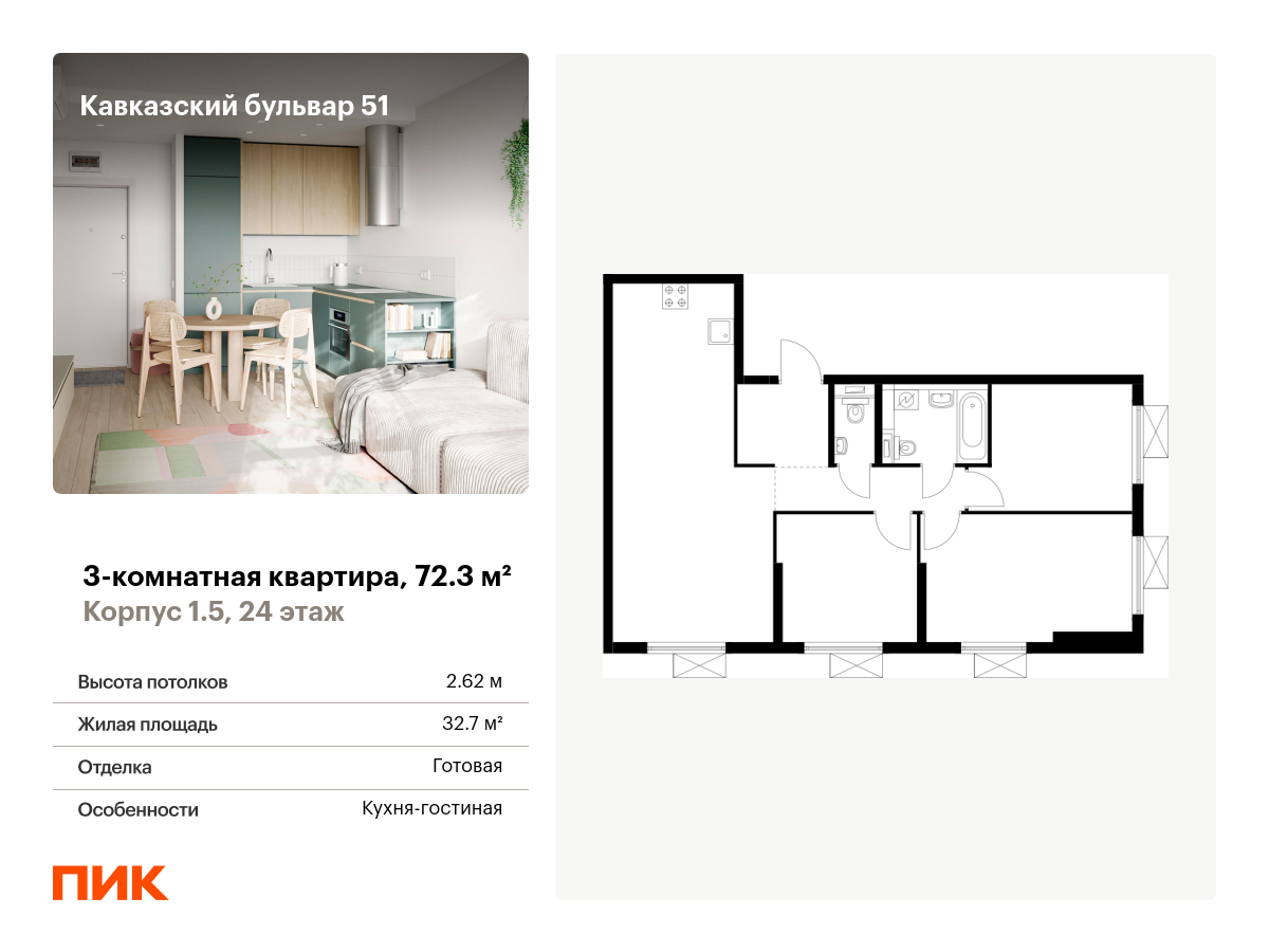 Евро трехкомнатные квартиры в Кавказский бульвар 51
