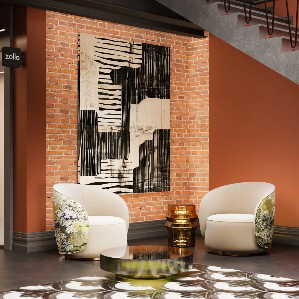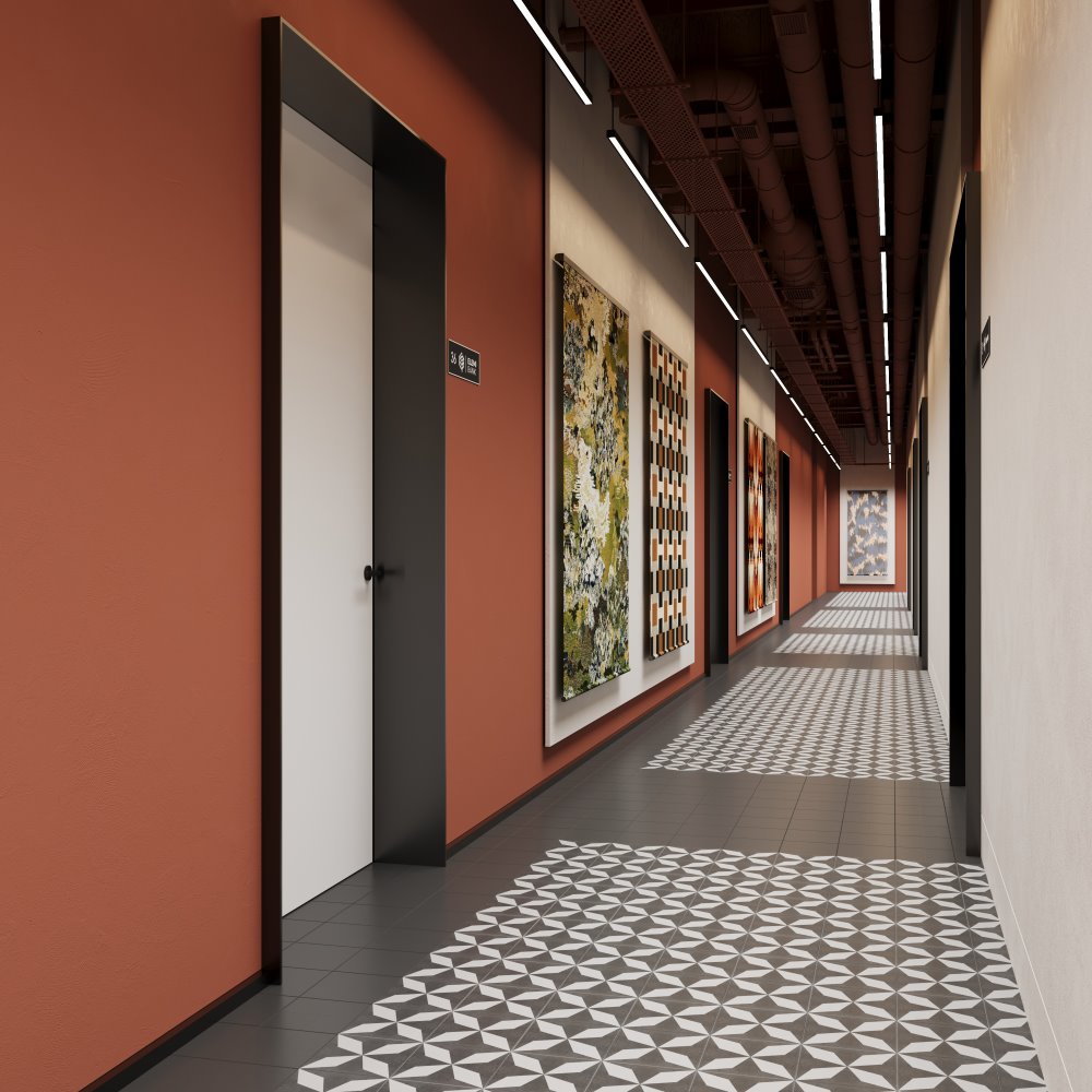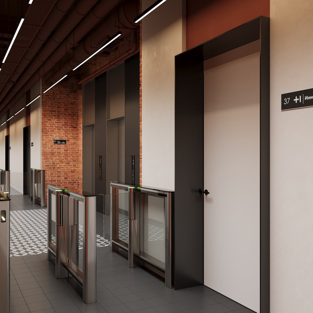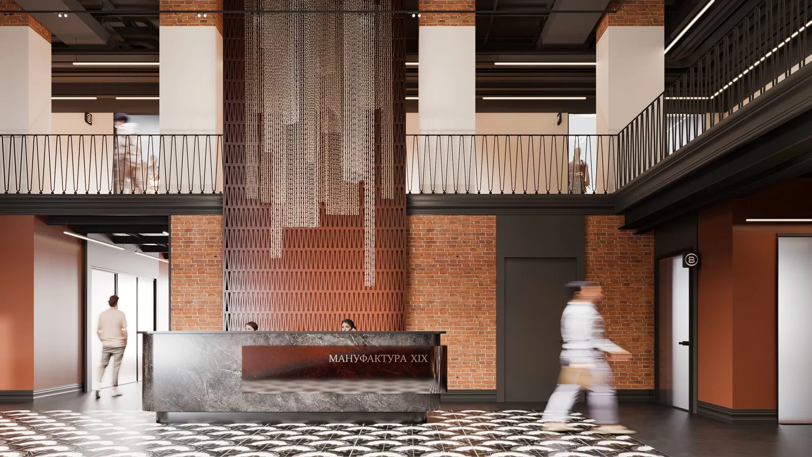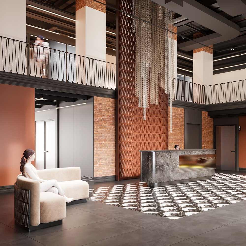 Офисы занимают два этажа небольшого и уютного здания, ещё на двух расположена ретейл-галерея. В деловом центре создано эстетичное лобби с выдержанным дизайн-кодом. Сохранённый подлинный кирпич в отделке пространства возвращает к истории места. Стойка ресепшен оформлена мрамором, также в зоне лобби использованы тканые гобелены и керамогранит.