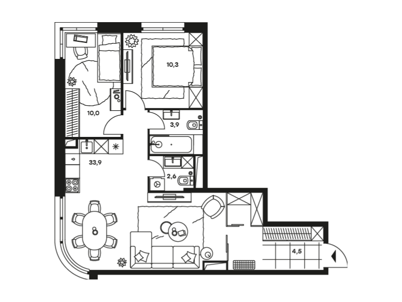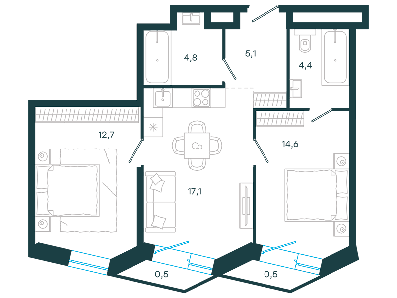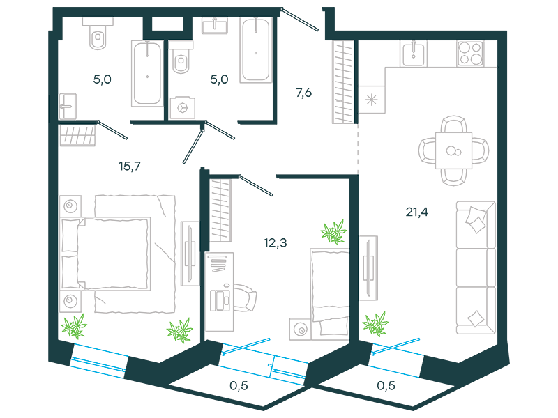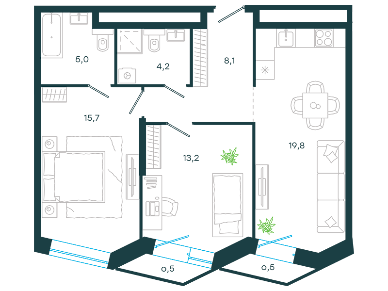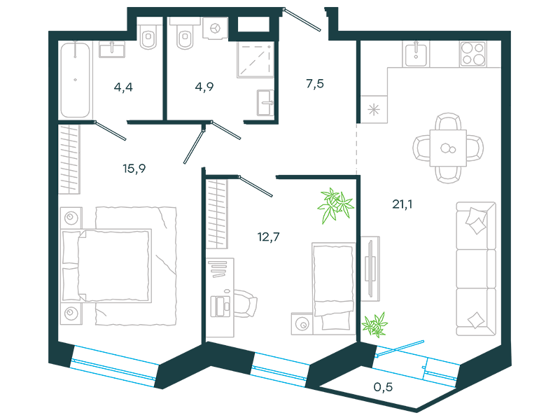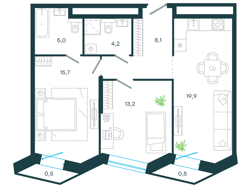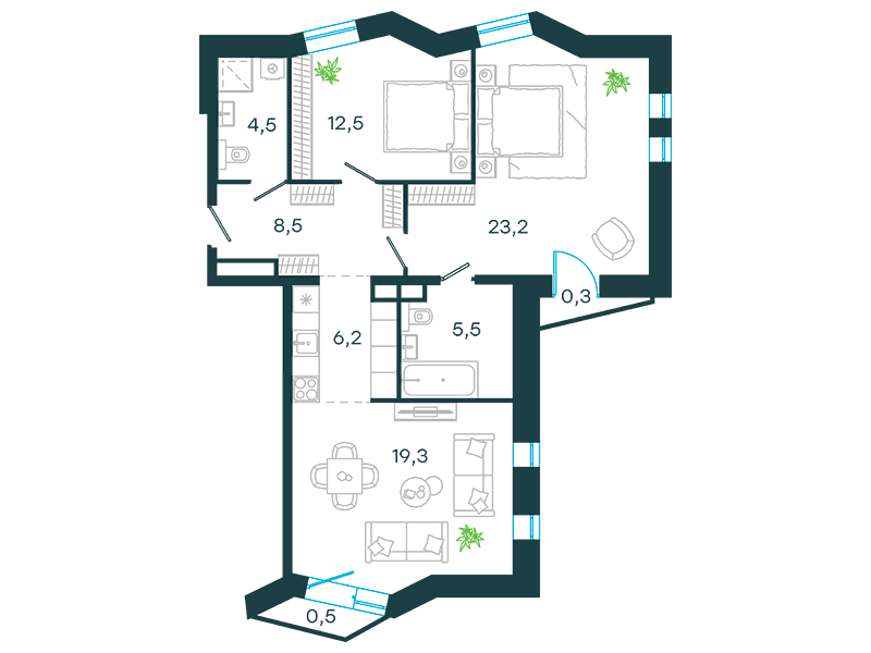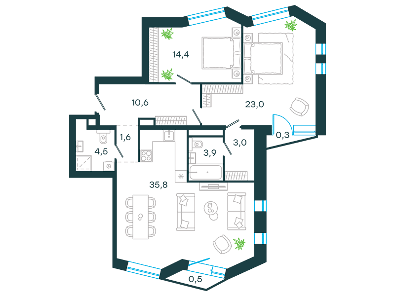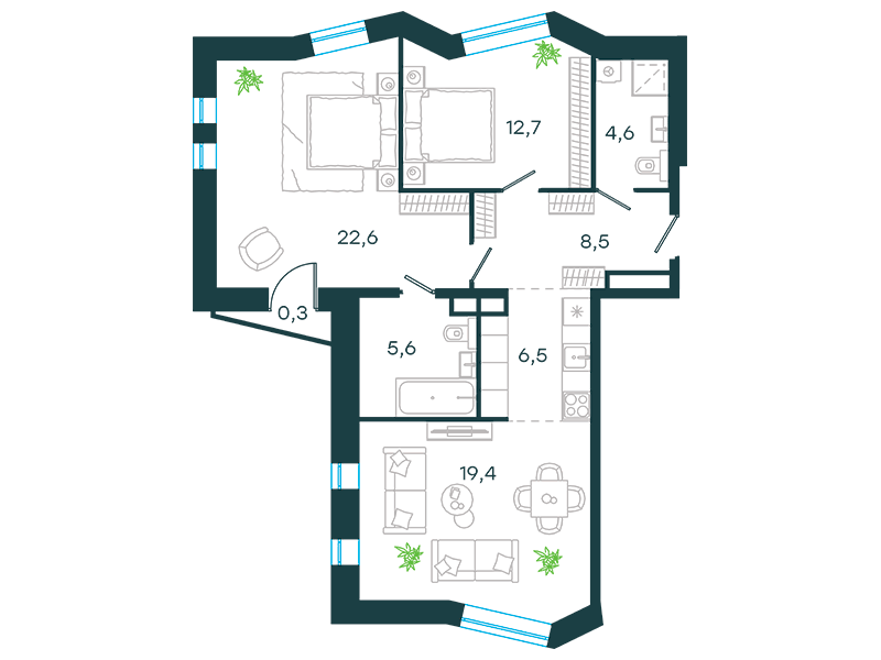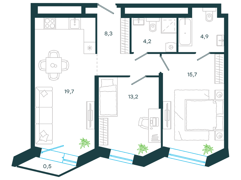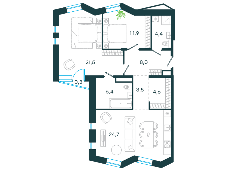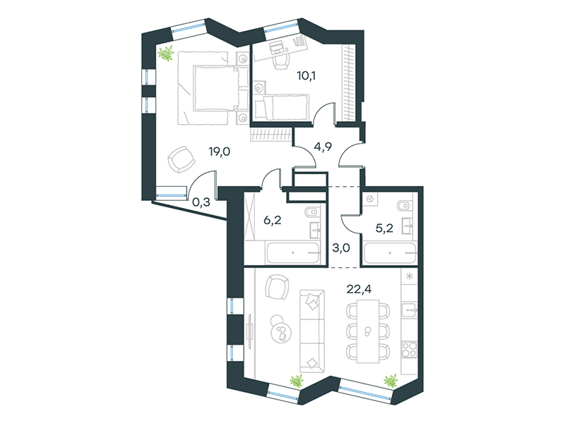 Проект представляет собой три односекционных 25-этажных здания на 747 апартаментов с отделкой и без нее, площадью от 23 кв. м. Их отличительна особенность – возможность объединения нескольких лотов в единый объект. Соответственно, максимальная площадь такого предложения может быть более 200 кв. м. К продаже предлагаются 14 вариантов планировок, в том числе, такие редкие, как апартаменты с патио и пентхаусы с террасой.