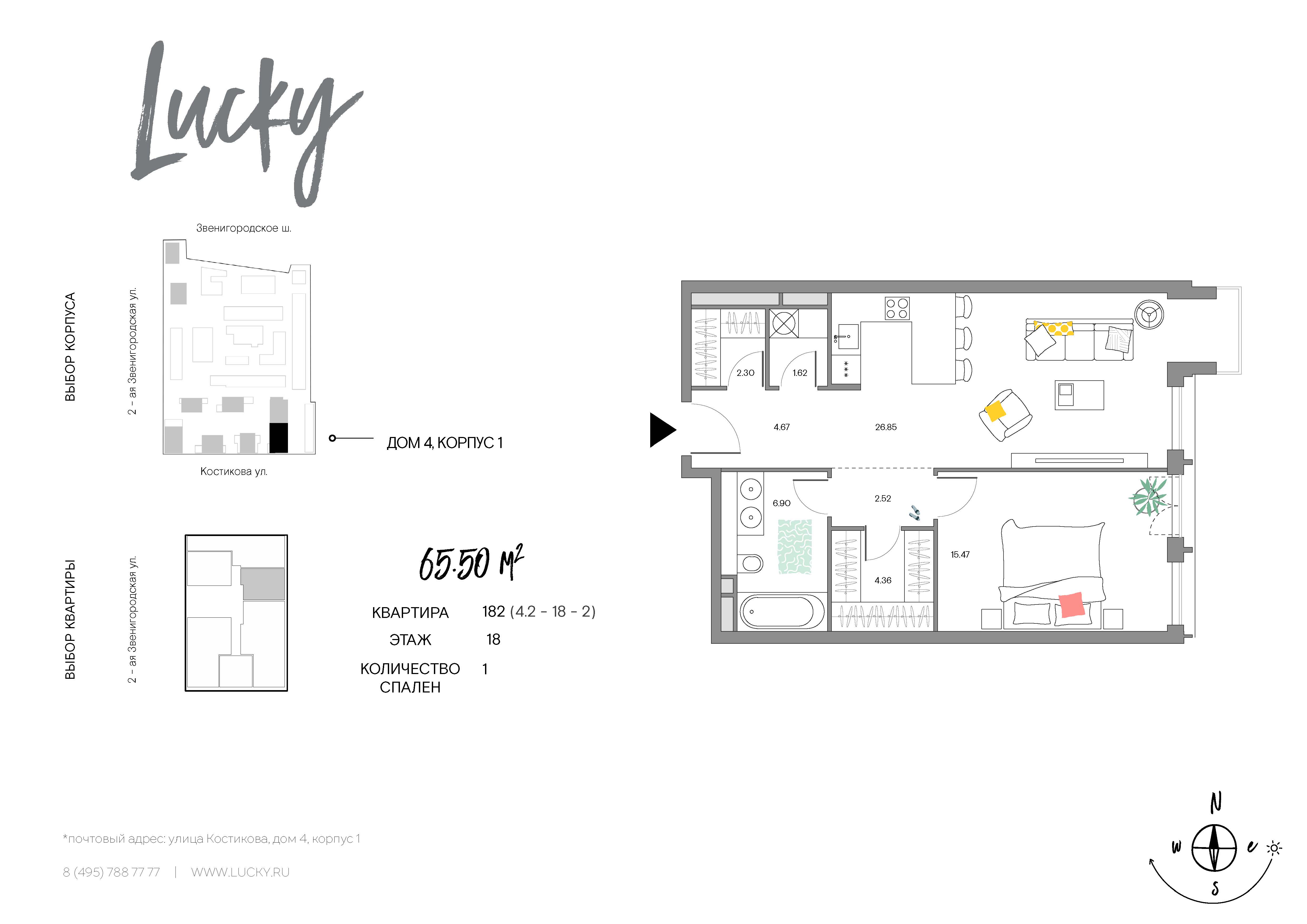 Жилой квартал Lucky включает семь 21-этажных башен и один 13-этажный дом. Локация новостройки ограничена Улицей 1905 года, 2-ой Звенигородской, Звенигородским шоссе и улицей Костикова. Визуально он разбит на две части, так называемый «верхний город» с высотками и «нижний» –с малоэтажными зданиями коммерческого назначения. К продаже предлагаются квартиры с одной, двумя, тремя и четырьмя комнатами, площадью от 41,5 до 290 кв. м и потолками 3 м. Все лоты продаются с чистовой дизайнерской отделкой (в том числе с высококачественной сантехникой и кухонным оборудованием итальянского бренда Dada).