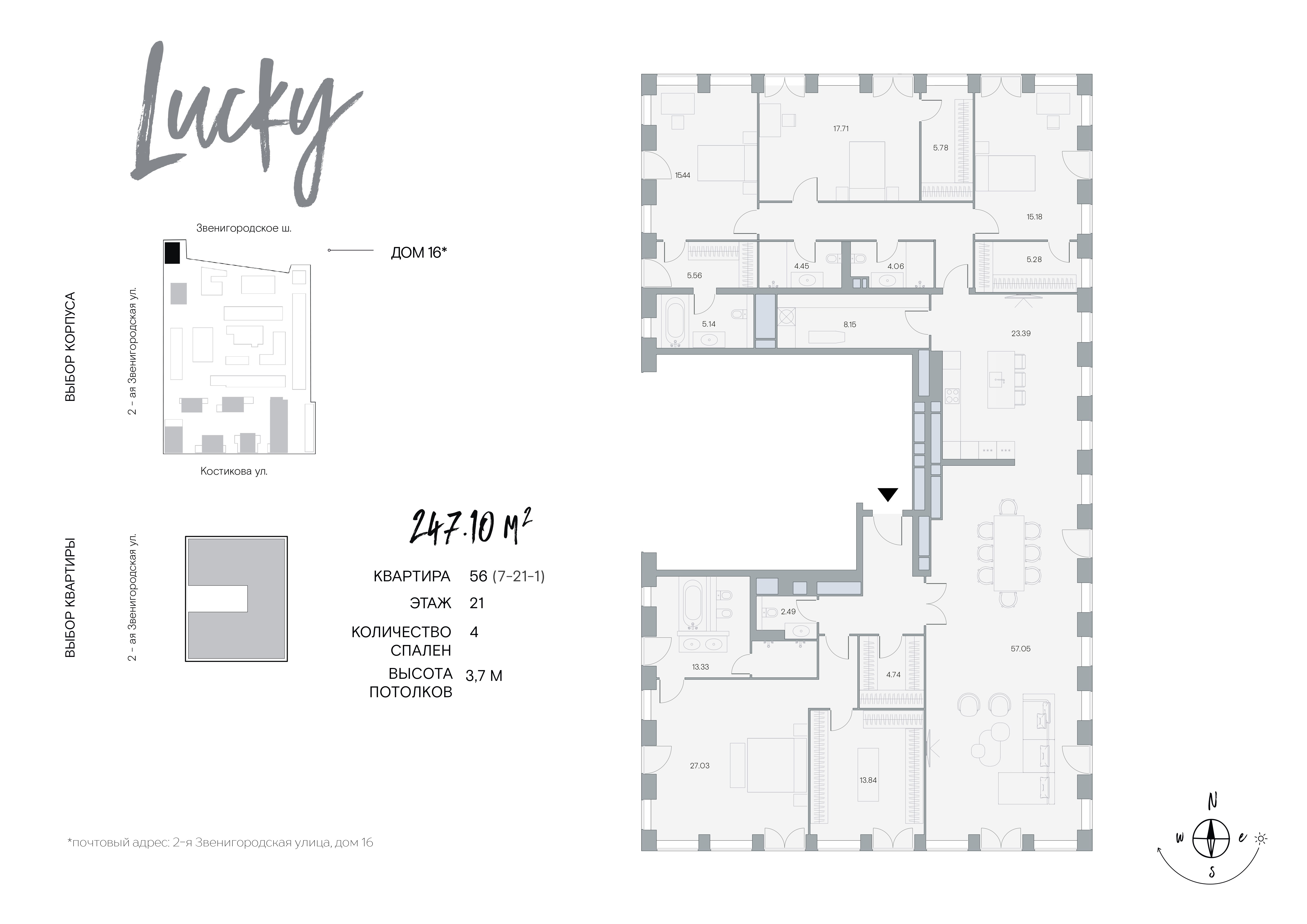 Жилой квартал Lucky включает семь 21-этажных башен и один 13-этажный дом. Локация новостройки ограничена Улицей 1905 года, 2-ой Звенигородской, Звенигородским шоссе и улицей Костикова. Визуально он разбит на две части, так называемый «верхний город» с высотками и «нижний» –с малоэтажными зданиями коммерческого назначения. К продаже предлагаются квартиры с одной, двумя, тремя и четырьмя комнатами, площадью от 41,5 до 290 кв. м и потолками 3 м. Все лоты продаются с чистовой дизайнерской отделкой (в том числе с высококачественной сантехникой и кухонным оборудованием итальянского бренда Dada).