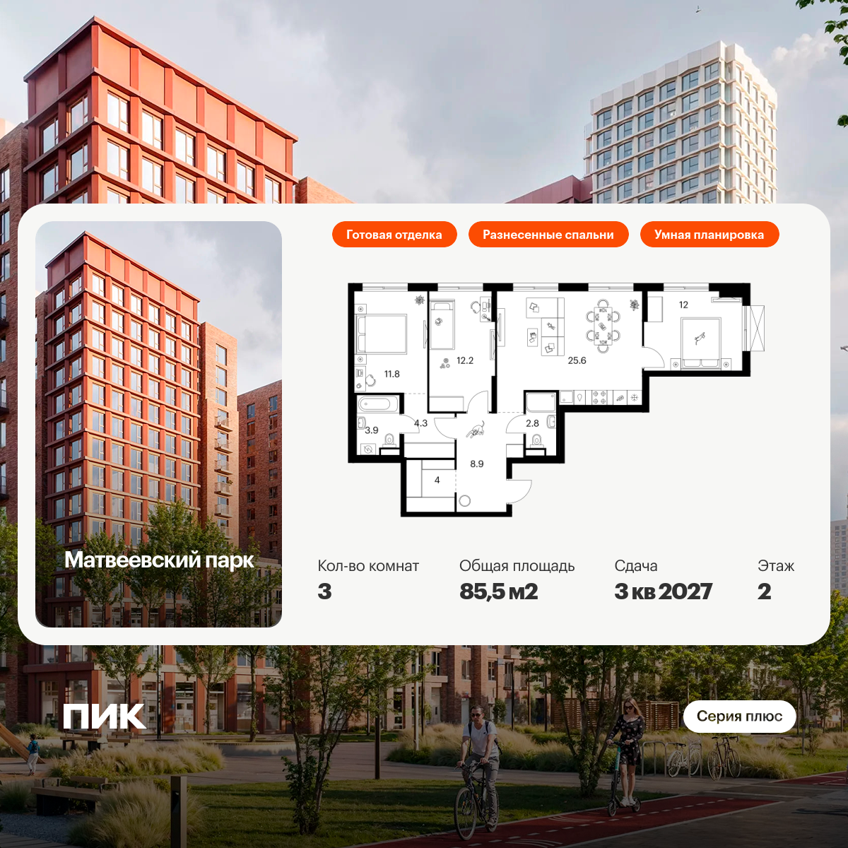 Проект входит в состав Матвеевского кластера — современного района, где есть всё необходимое для комфортной жизни. Здесь появятся пять новых школ, шесть детских садов, поликлиника и многофункциональный спортивный комплекс. Откроются площадки для мини-футбола и стритбола, а также SportHub Extreme — зона площадью более 3 500 м² для любителей экстремальных видов спорта.