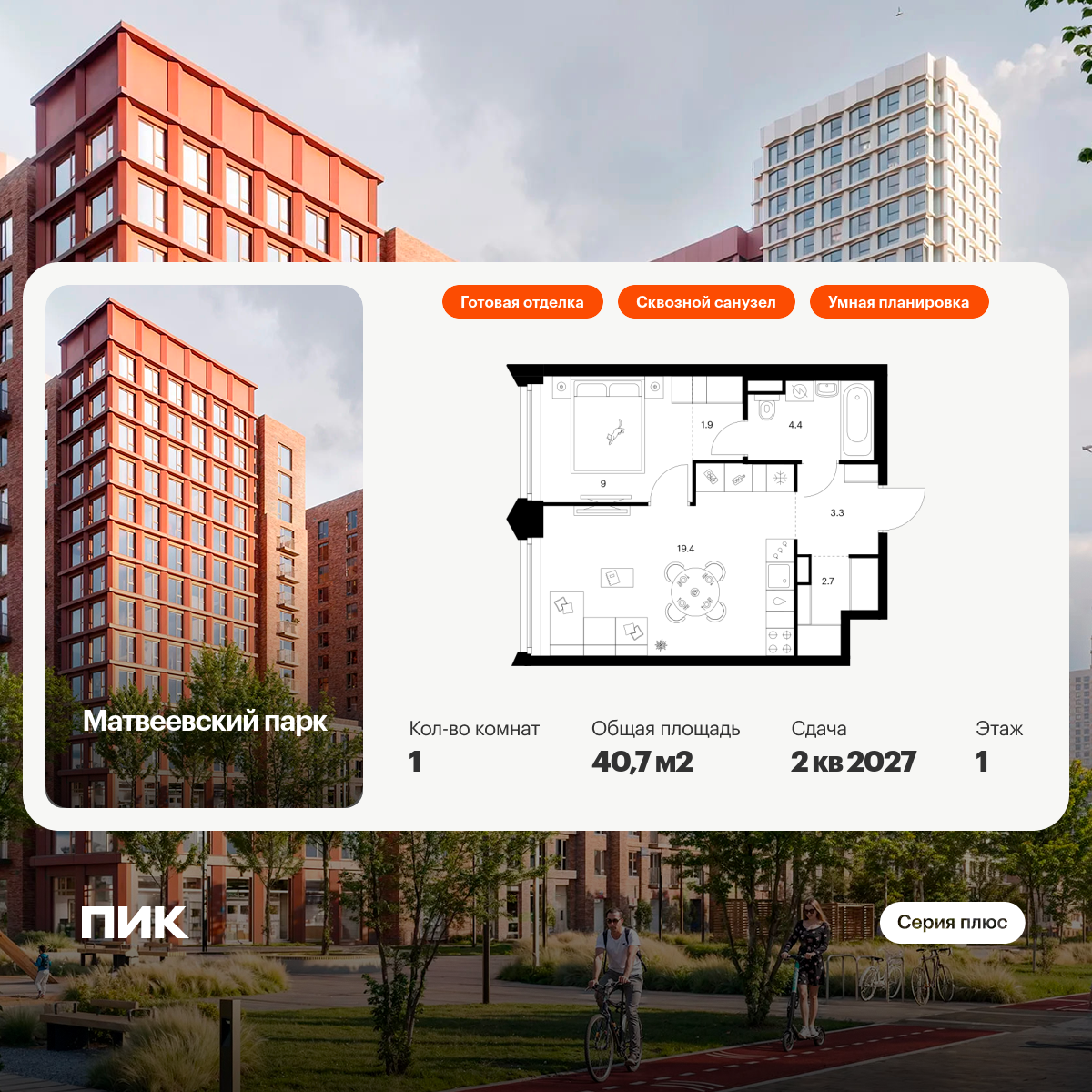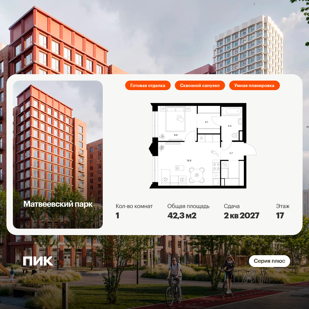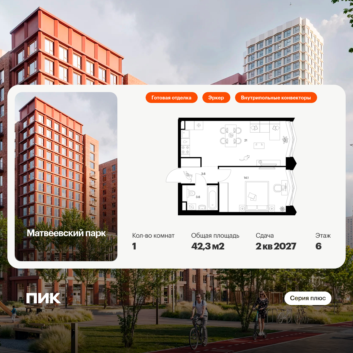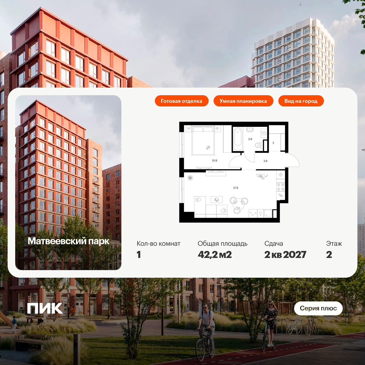 «Матвеевский парк» — проект «Серии плюс», расположенный на западе Москвы, в районе Очаково-Матвеевское. Ближайшая станция метро «Аминьевская» находится всего в 3 минутах пешком. Проект входит в состав Матвеевского кластера — современного района, где есть всё необходимое для комфортной жизни: социальная инфраструктура, парки и общественные пространства.