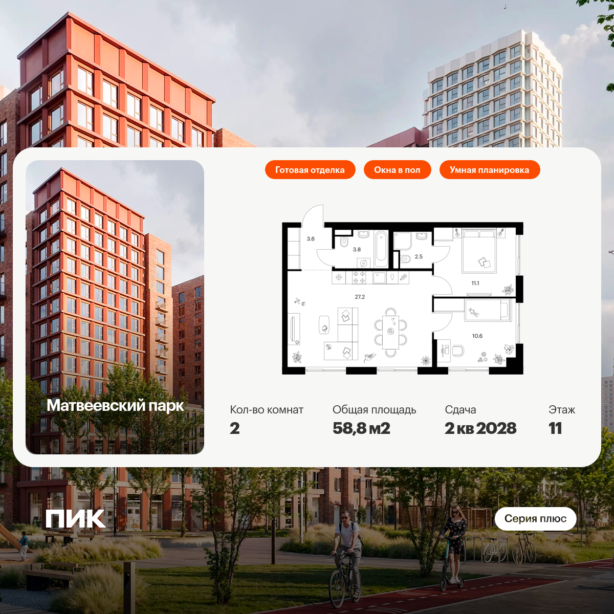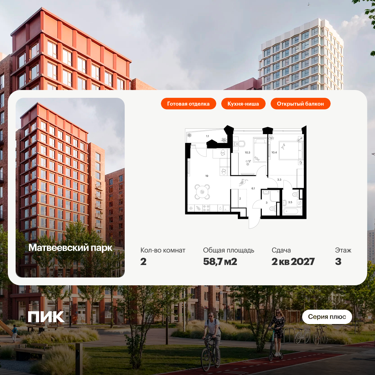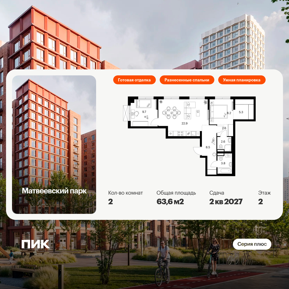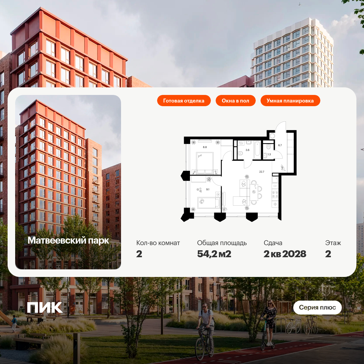 «Матвеевский парк» — проект «Серии плюс», расположенный на западе Москвы, в районе Очаково-Матвеевское. Ближайшая станция метро «Аминьевская» находится всего в 3 минутах пешком. Проект входит в состав Матвеевского кластера — современного района, где есть всё необходимое для комфортной жизни: социальная инфраструктура, парки и общественные пространства.