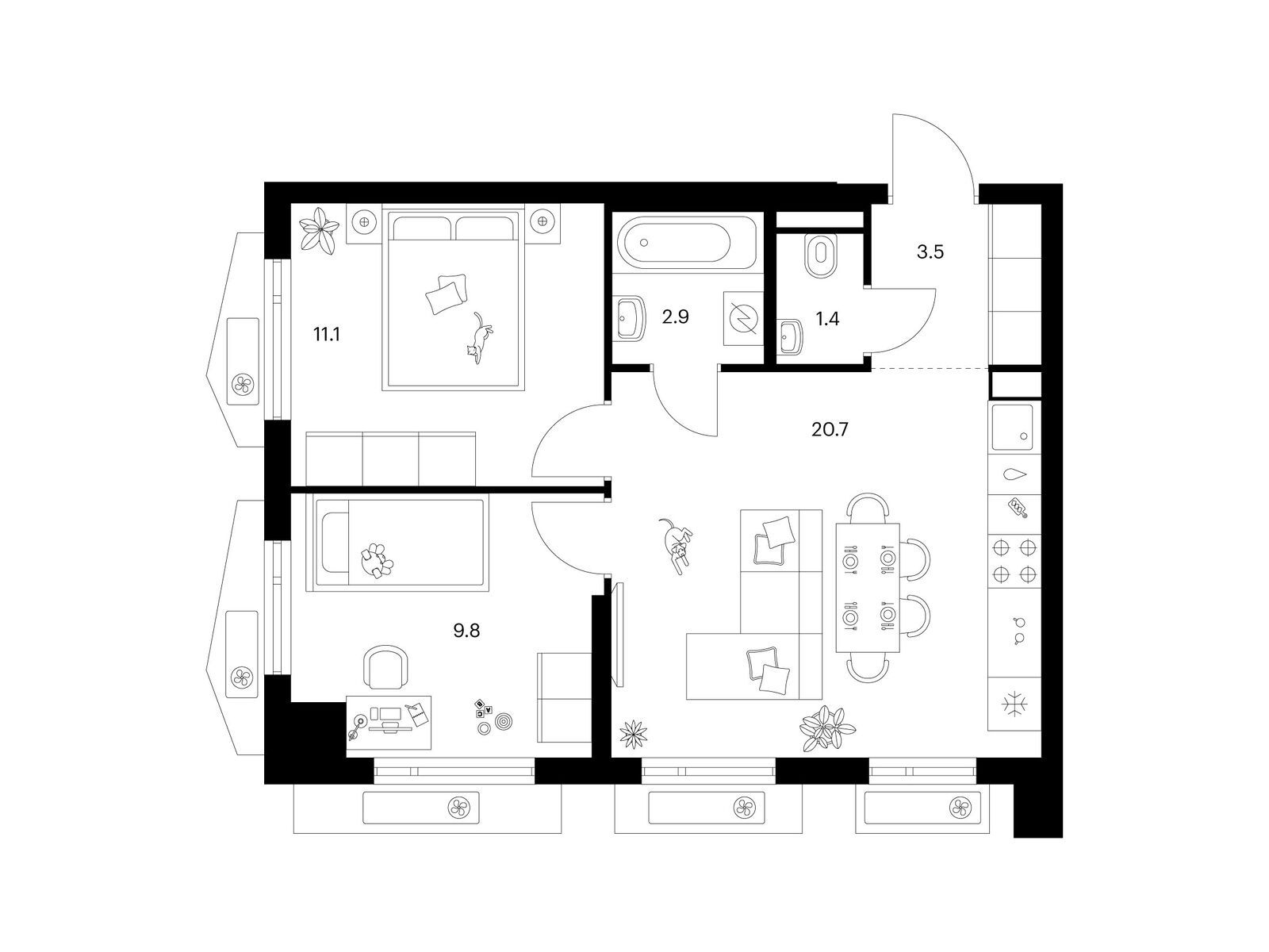 В «Мичуринском парке» широкий выбор планировок для разных сценариев жизни. Мы предусмотрели мастер-спальни с собственной ванной и местом для гардероба. Есть планировки с просторной кухней-гостиной, постирочной и дополнительным санузлом. В проекте можно найти уникальные форматы квартир с эркерами, окнами в пол, одним или двумя балконами в квартире.