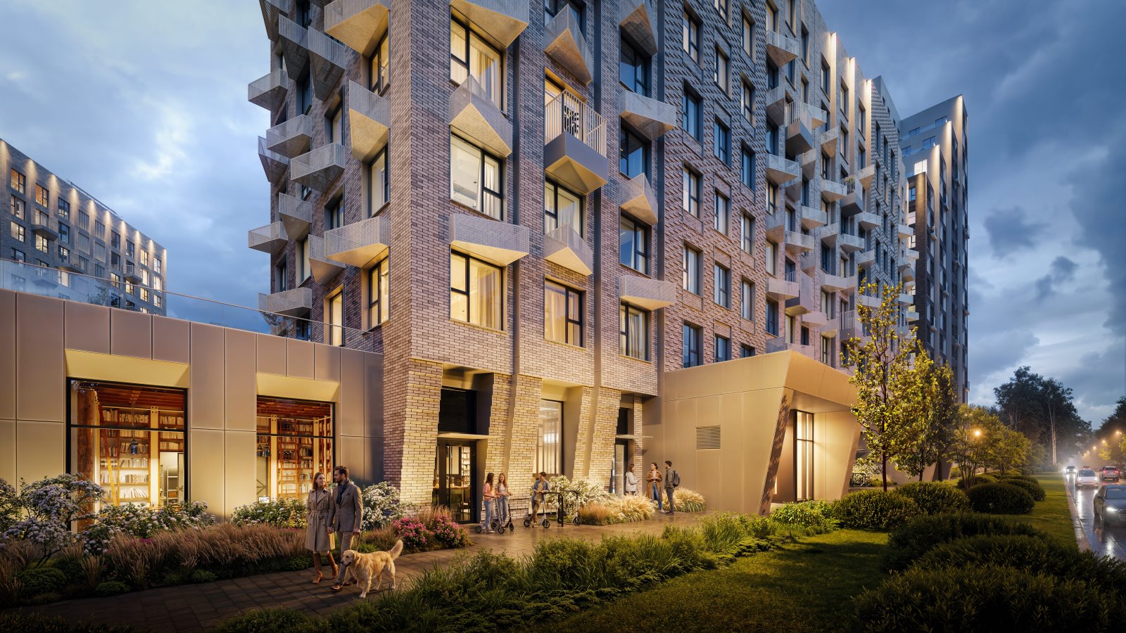 Благоустройство в проекте навеяно северной природой. Через квартал протянется пешеходный бульвар для прогулок и отдыха на свежем воздухе. Во дворах будут ждать зелёные парки с местами для отдыха, детскими и спортивными площадками. На первых этажах домов — торговая аллея с магазинами, кафе и полезными сервисами. А для владельцев автомобилей построим двухуровневый подземный и два наземных паркинга.