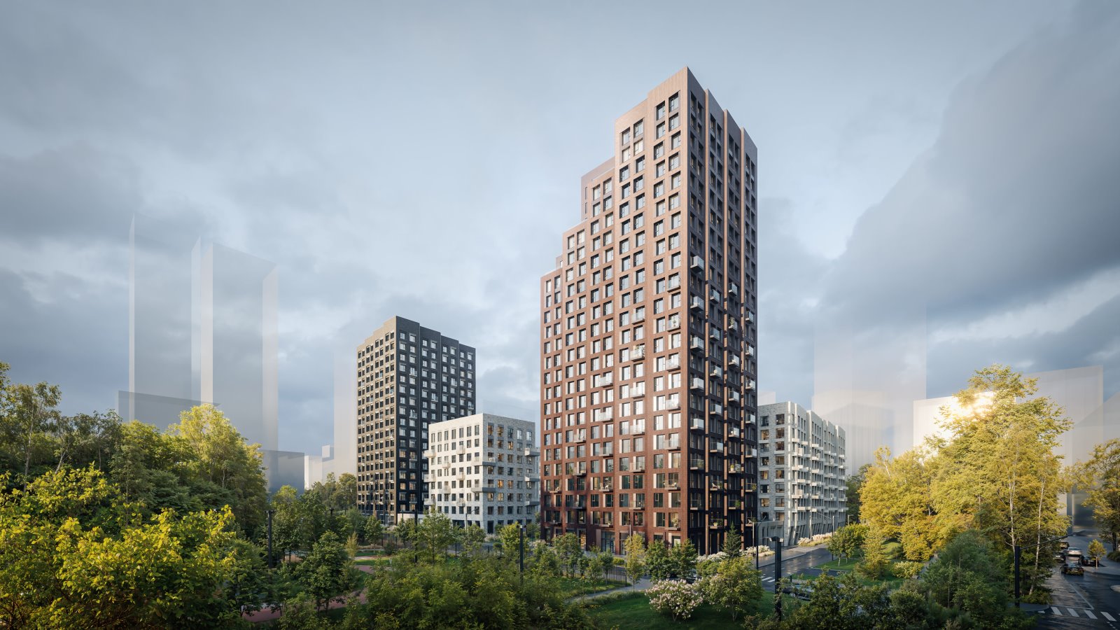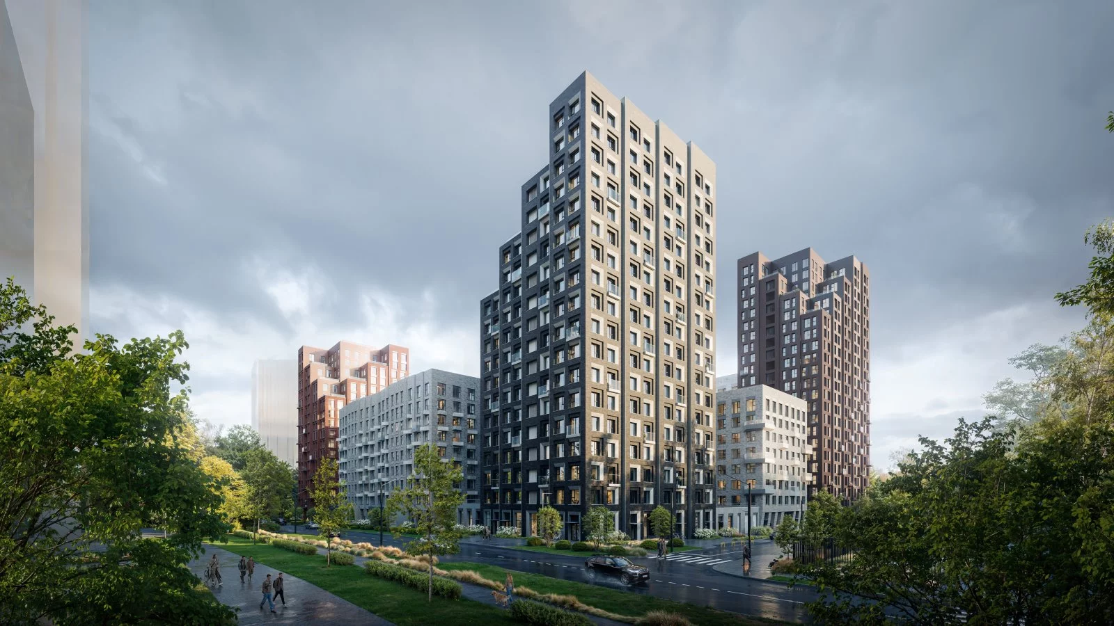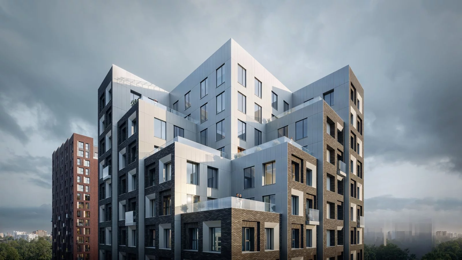 Архитектура квартала навеяна северной природой: разновысотные здания повторяют живописные линии северных скал и высоких хвойных деревьев. Это отражено и в колористике — фасады окрашены в цвета серого гранита, сосновой коры и серебристой глади воды.