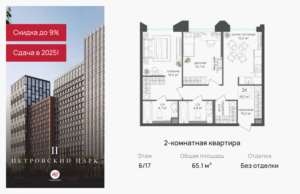 РГ-Девелопмент имеет репутацию надежного застройщика в городе Москва и сдал уже более 33 объектов. На данный момент в продаже имеет 231 квартир в этом жилищном комплексе.