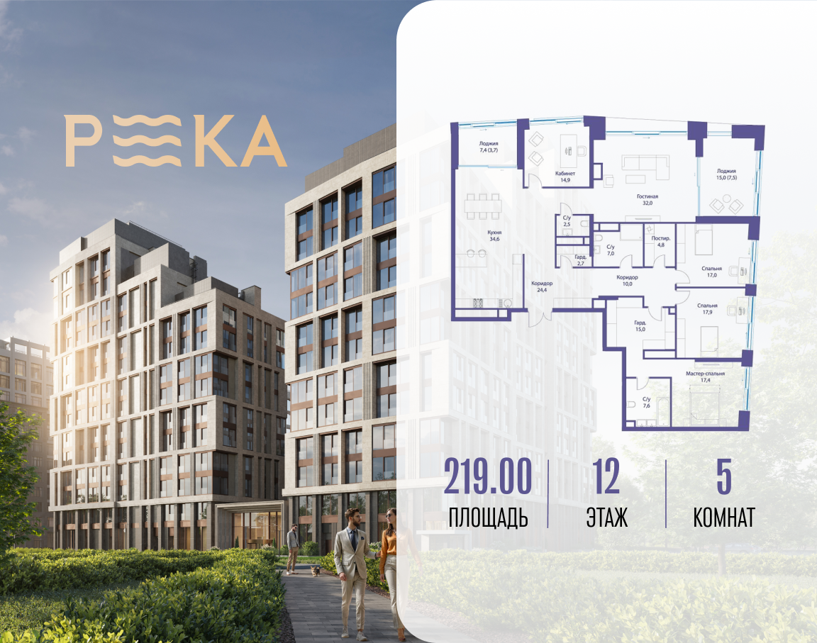 «Река» - клубный дом переменной высотности от 9 до 12 этажей. В доме предлагаются квартиры элитного класса (2-4 квартиры на этаже) площадью от 57 м² до 325 м² – от однокомнатных до пентхаусов. Высота потолков на типовых этажах – 3,65 м, в пентхаусах – 4,5 м. Представлены квартиры с окнами «в пол», с лоджиями и террасами, с зимними садами, с окнами в ванных, с возможностью установки камина. Одна из секций целиком отведена под квартиры с финишной отделкой по авторскому дизайн-проекту.