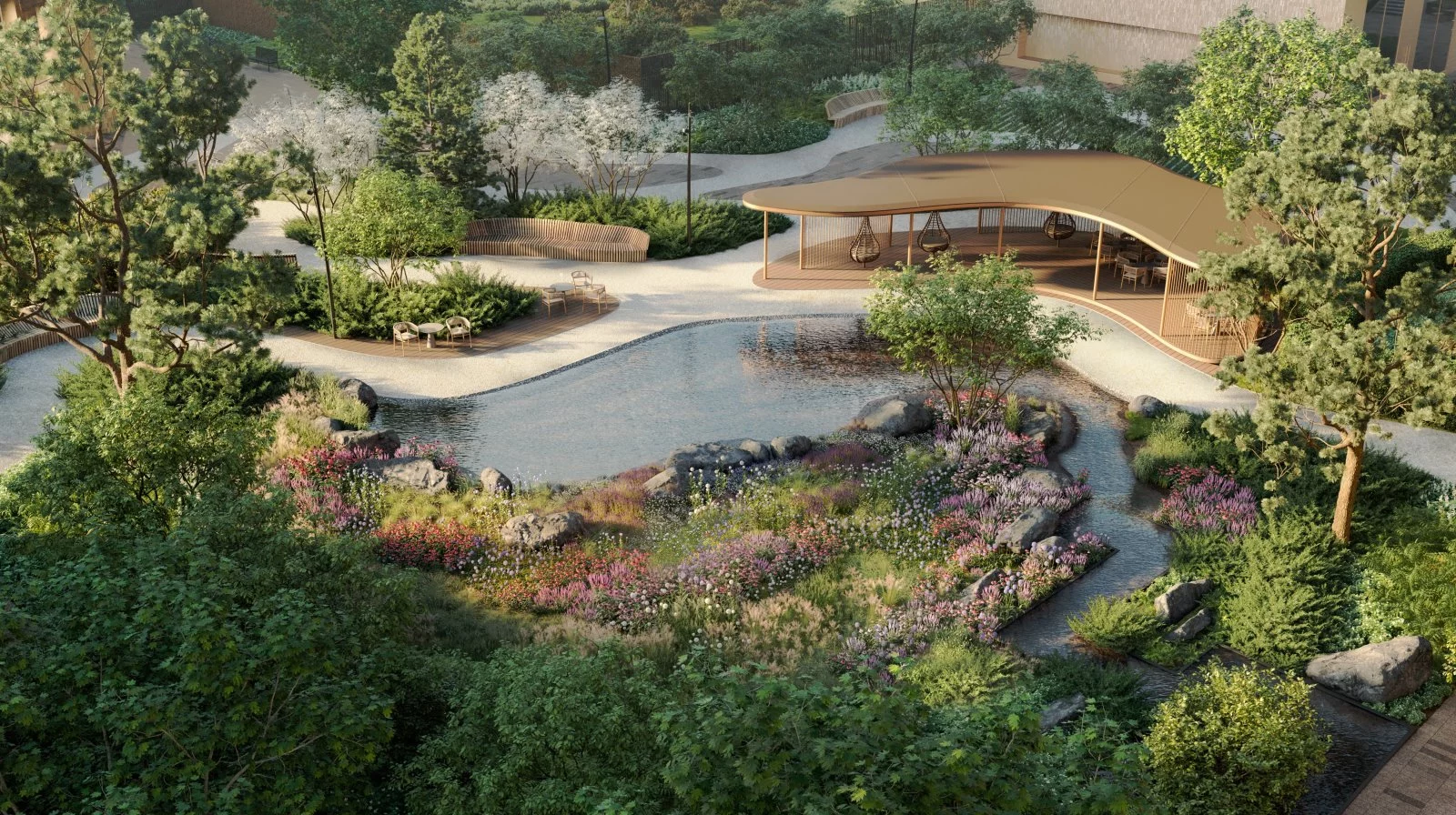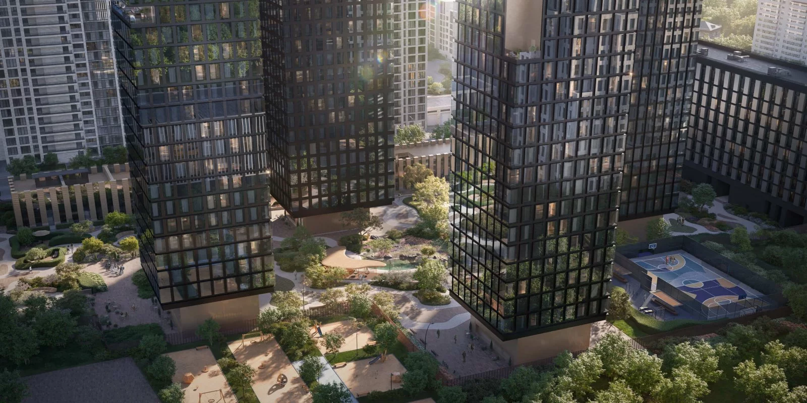 Двор-парк разделён на зоны активного и тихого отдыха. В нём оборудованы универсальная многофункциональная спортивная площадка для футбола, баскетбола, волейбола и других активных игр и воркаут-зона по стандарту Fit Lab. Для маленьких жителей на свежем воздухе предусмотрена развивающая детская площадка по стандарту Kid’s Lab. Для спокойного досуга созданы зелёные кабинеты с мягкой мебелью, зелёная гостиная с навесом, зона с беседками и шезлонгами, гамаки, уютный пруд с пошаговыми дорожками и пространство для занятий йогой. О ценности времени напоминают и арт-объекты, в том числе секретный фонтан-часы. В 2025 году двор-парк квартала завоевал платиновую награду международной премии International Architecture and Design Awards.