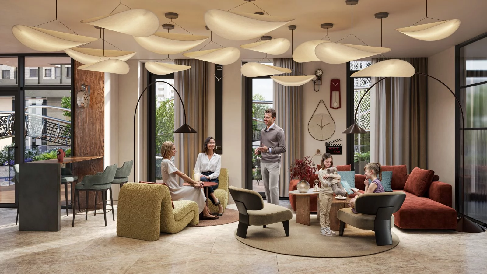 Во всех домах квартала созданы просторные и комфортные лобби с потолками высотой до 7 м. Дизайн пространств в 2025 году завоевал высшие награды международных премий International Architecture and Design Awards и Global Future Design Awards. Лобби оформлены дизайнерской мебелью и изысканными материалами: натуральным камнем, медью, текстурированным стеклом. Здесь расположены комната для хранения колясок и велосипедов, гостевой санузел.