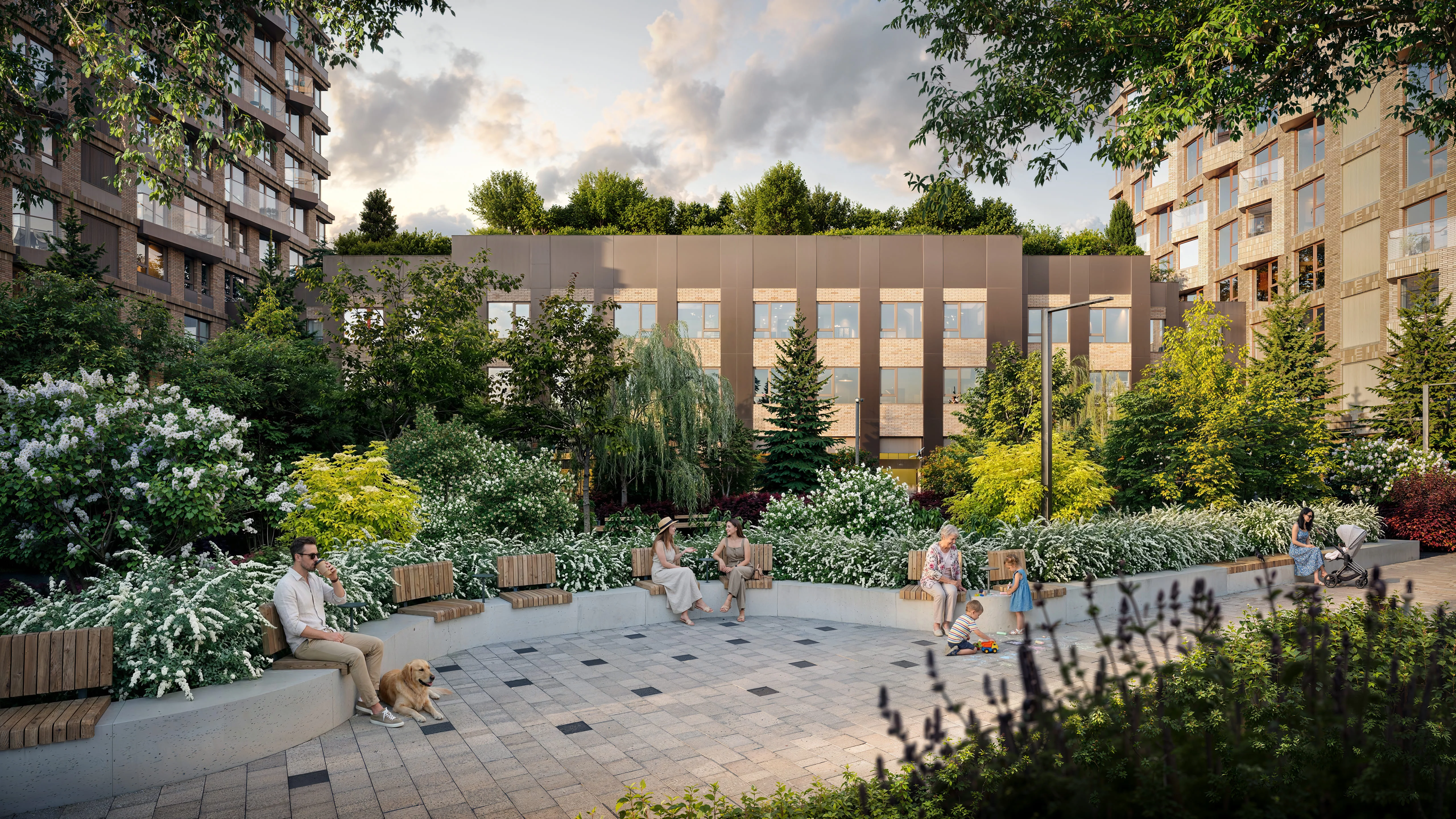 Архитектура квартала органично вписывается в окружающий ландшафт. В отделке используются натуральные материалы и спокойные цвета, которые дополняют природные пространства вокруг квартала.