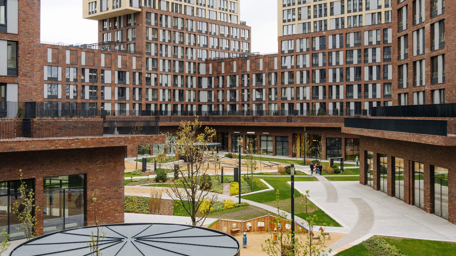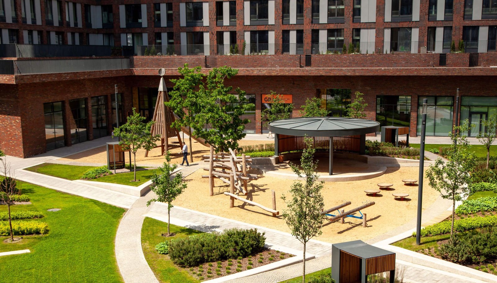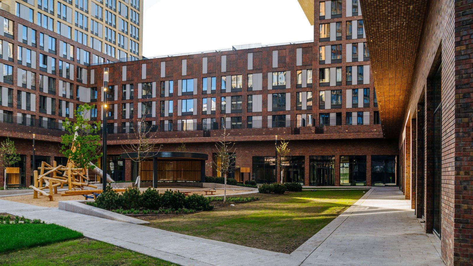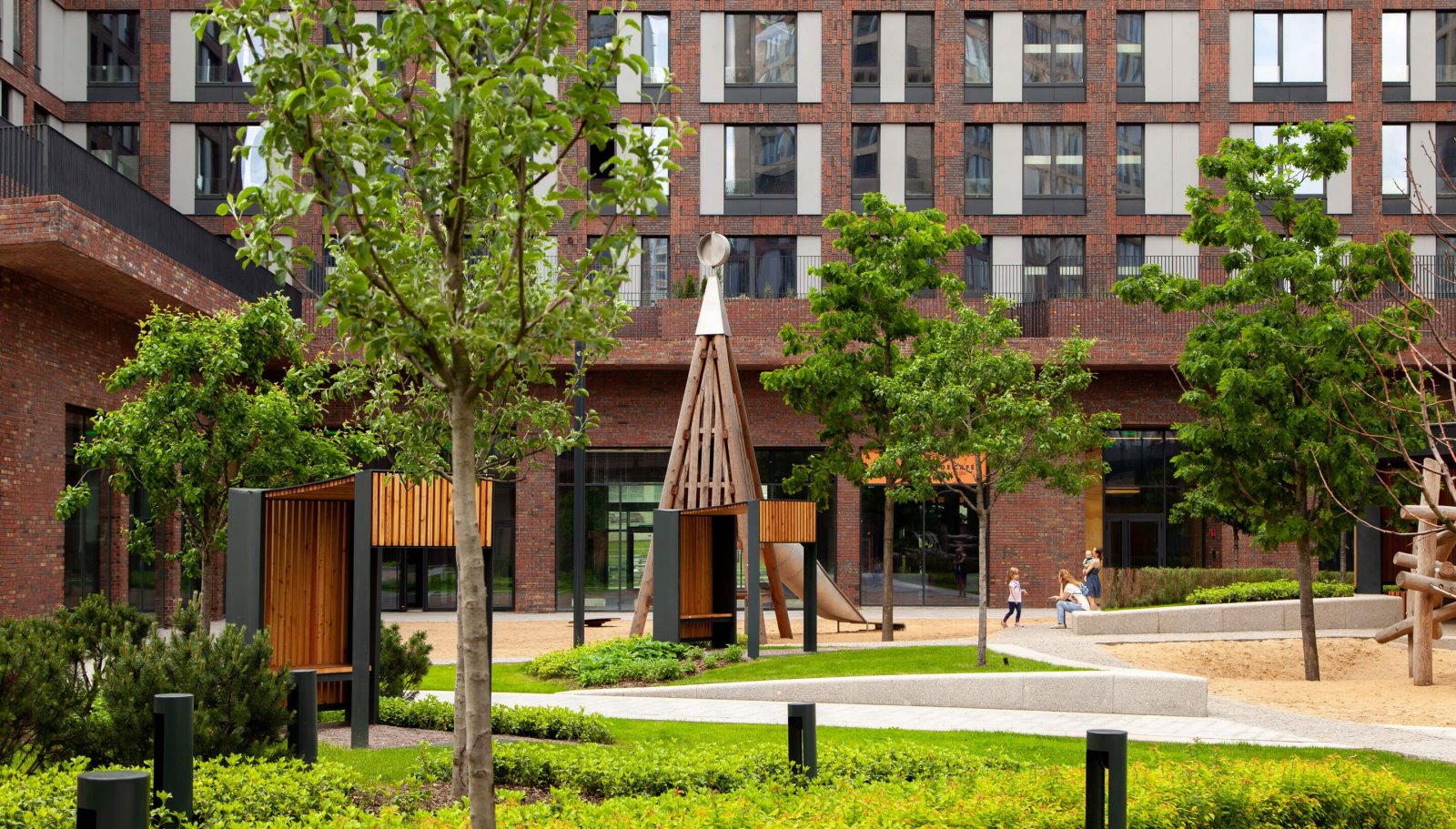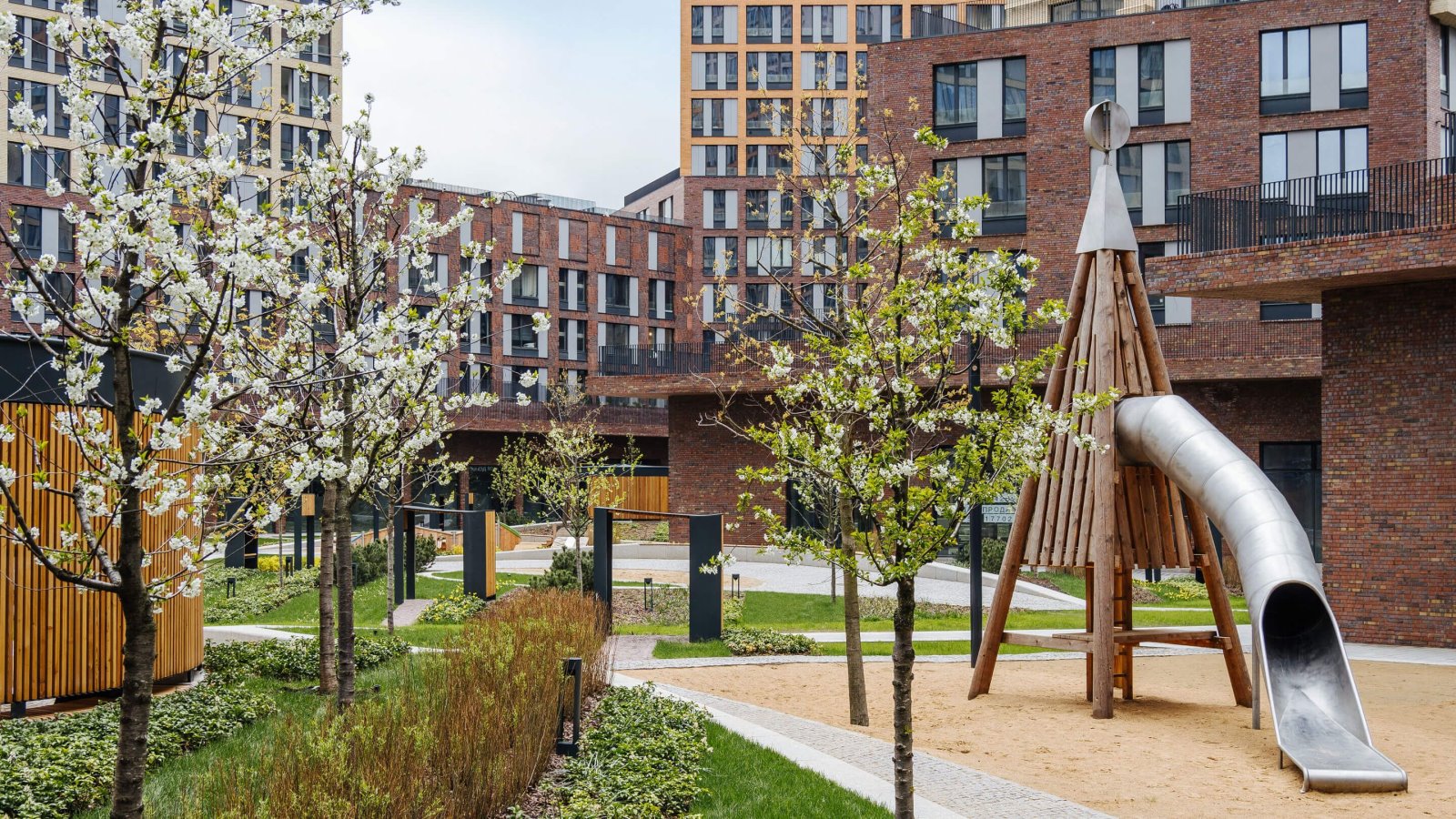 Дизайн двора также разработан голландцами: благодаря специфическому подбору растений он в разное время года предстаёт в обновленном виде. Игровую площадку для детей делали с немецкими специалистами: она выполнена из натуральных материалов, с имитацией природного ландшафта. Территория круглосуточно находится под охраной и видеонаблюдением.