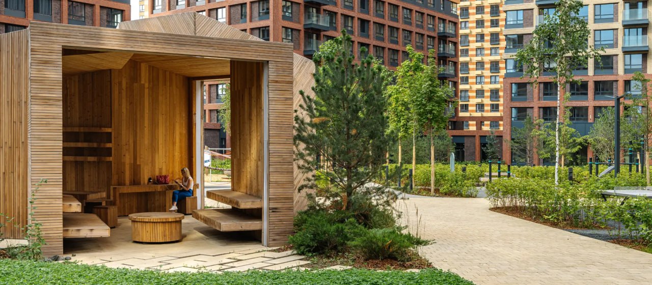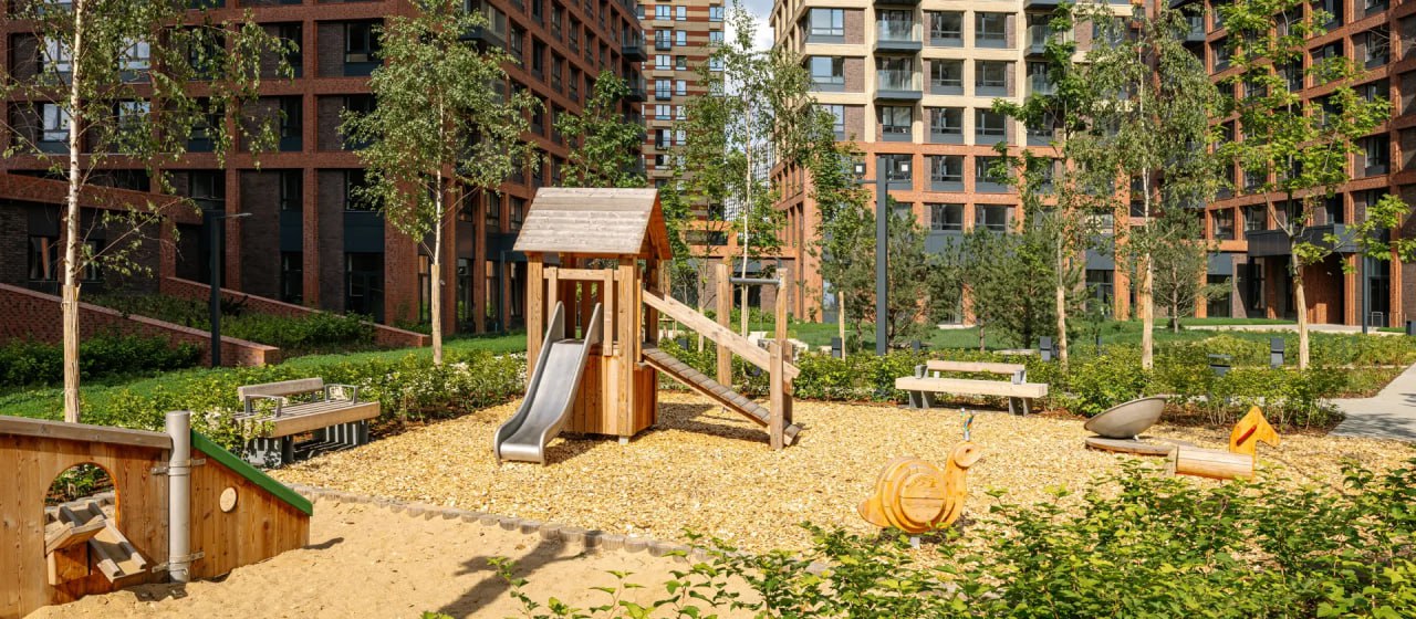Проект состоит из домов высотой от 9 до 21 этажей и уютных дворов-парков. На подземных этажах предусмотрены паркинги с велостоянкой и зарядками для электромобилей, а также вместительные кладовые. В светлых и просторных лобби будут комнаты для колясок и лапомойка для собак.