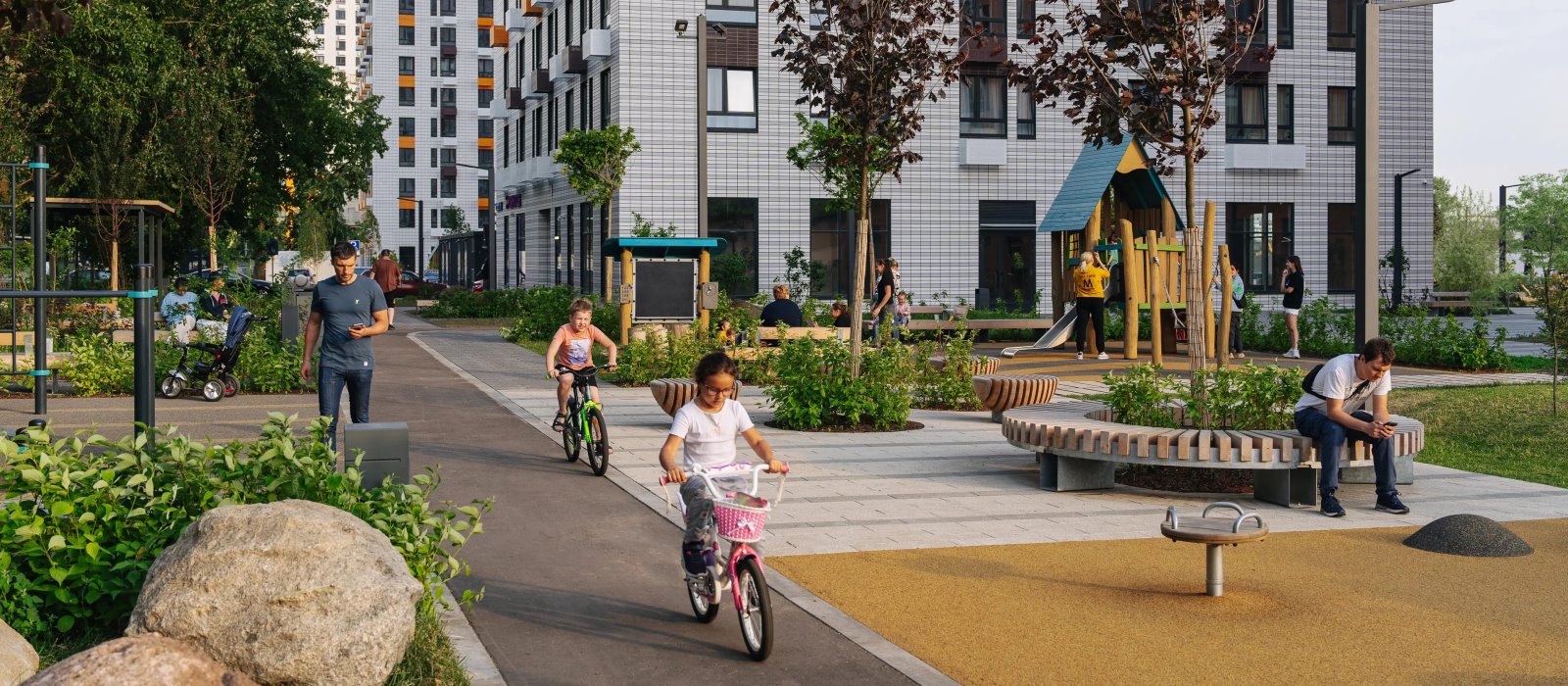 В проекте предусмотрена медленная зона для электросамокатов — с 7 утра до полуночи при въезде на территорию квартала скорость электросамокатов автоматически снижается до 15 км/ч.