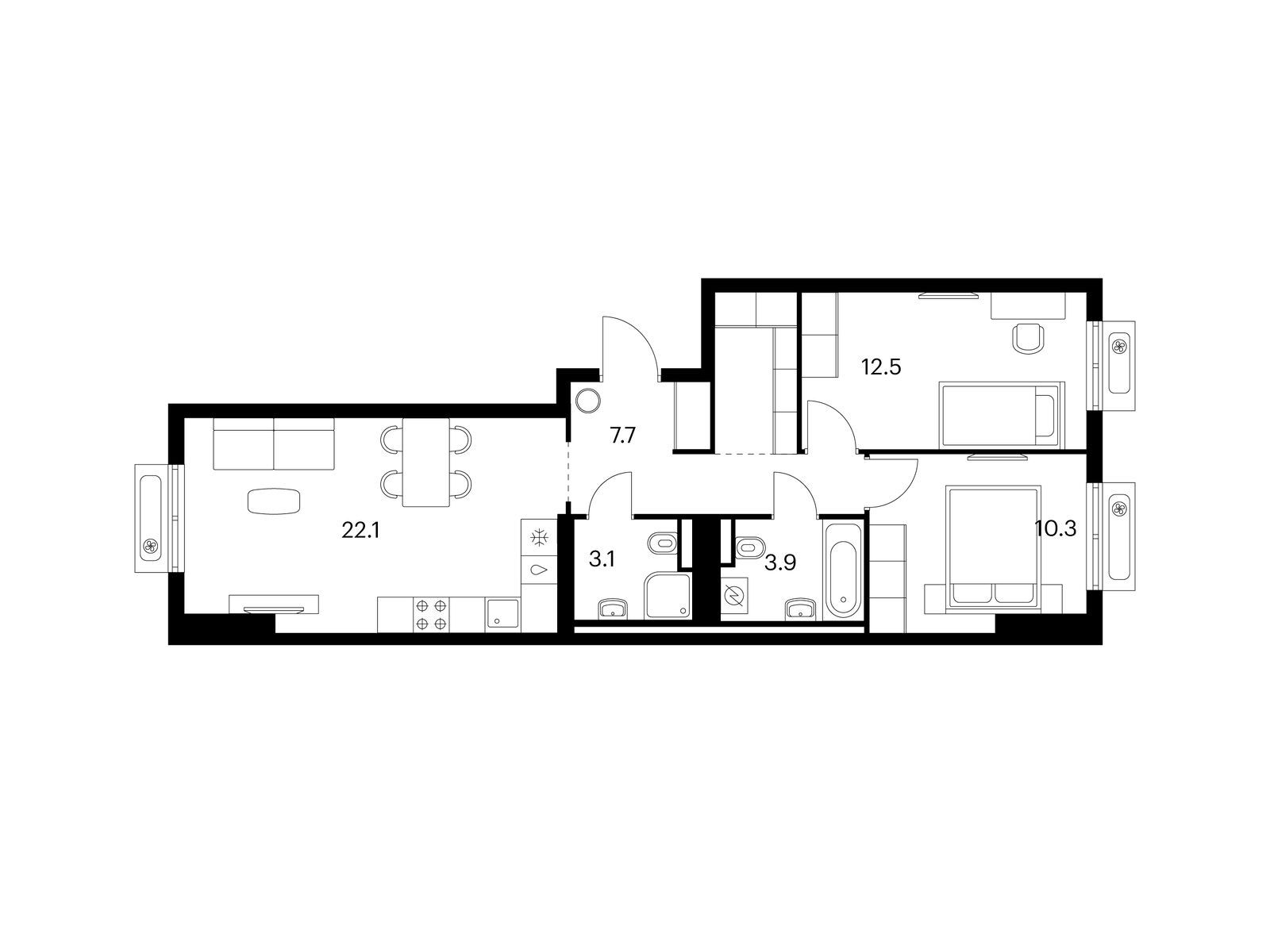 В проекте широкий выбор продуманных и функциональных планировок для разных сценариев жизни. Мы предусмотрели мастер-спальни с собственной ванной и выделенной зоной для гардероба. Также есть варианты с компактной кухней-нишей, постирочной и сквозным санузлом.