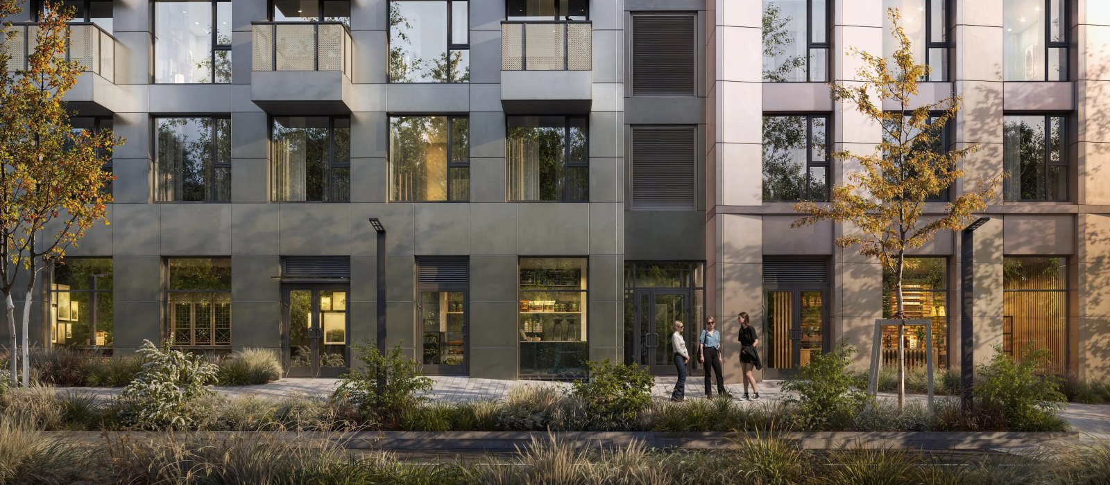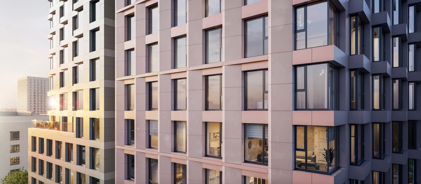 Квартал состоит из разноэтажных домов со ступенчатыми фасадами. Цветовая палитра проекта спокойная: оттенки белого и коричневого сочетаются с пастельным розовым и мятным.