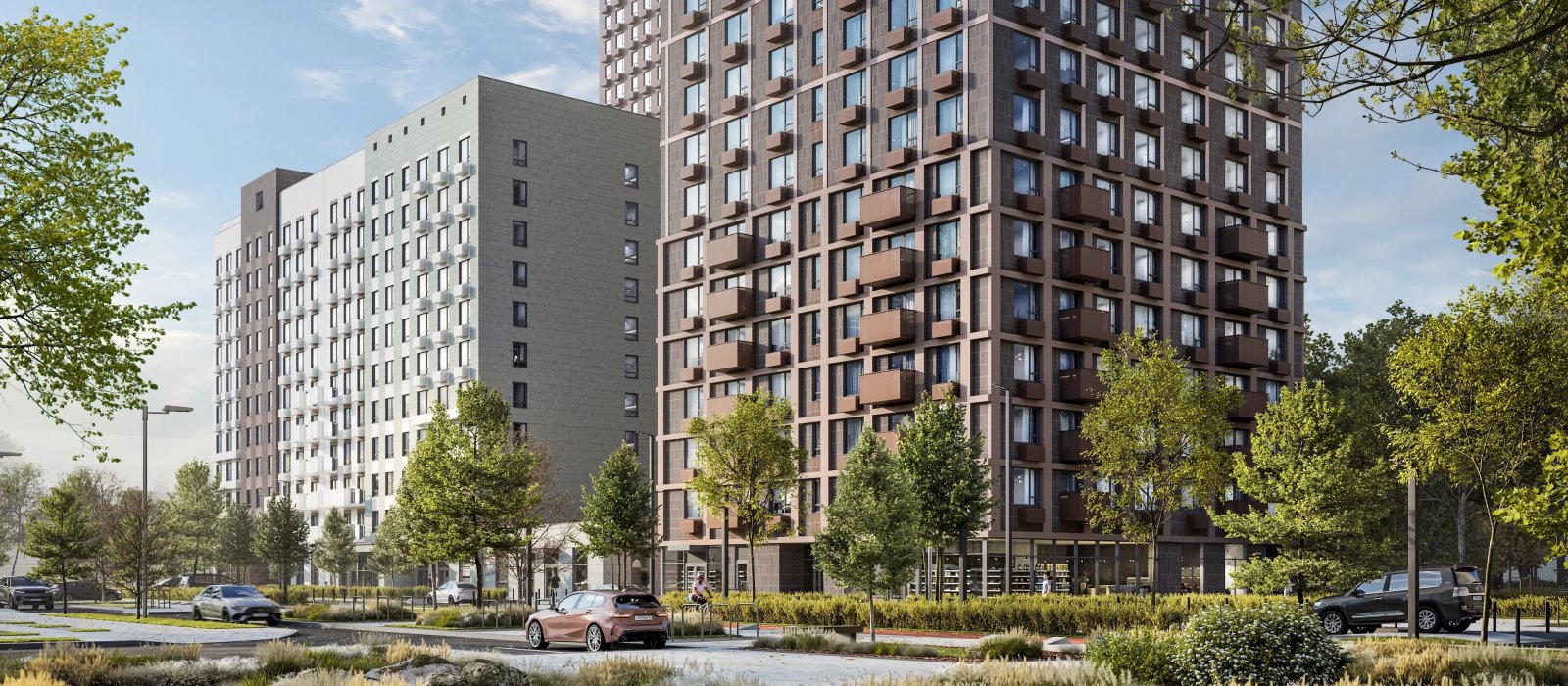 Дизайн проработан и внутри домов. На первых этажах — просторные и светлые лобби: мягкие тона выразительно дополнят контрастные чёрные и терракотовые акценты, а стеклянные двери дарят пространству много естественного света и ощущение простора.