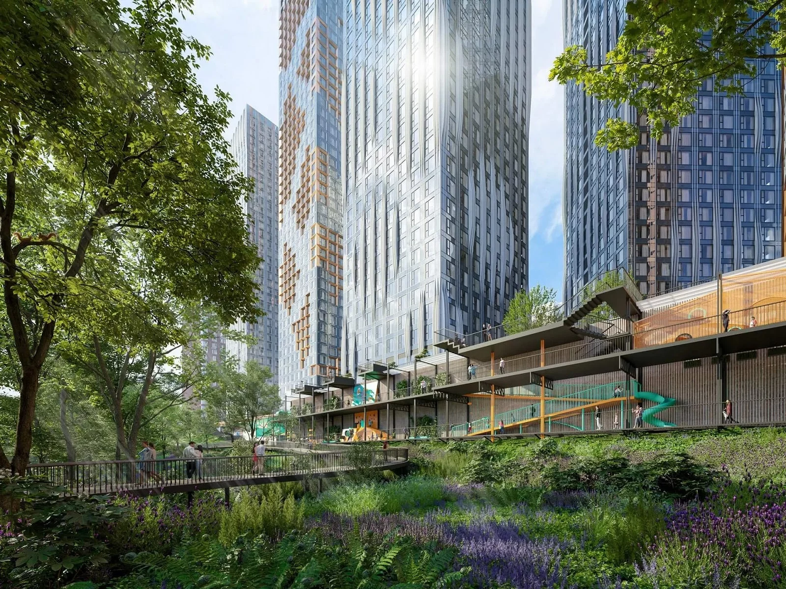 Проектом запланировано, что будет благоустроено 4,7 га территории, на которой будет расположен видовой мост. Также на территории ЖК появится вертикальная досуговая площадка вдоль стены стилобата.