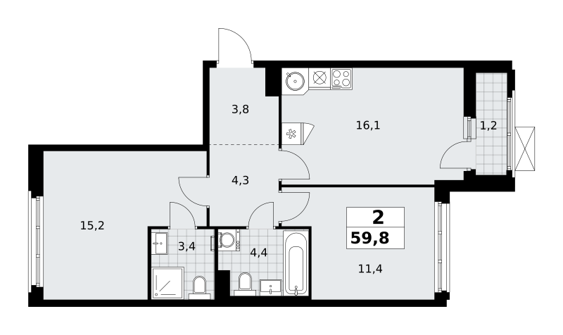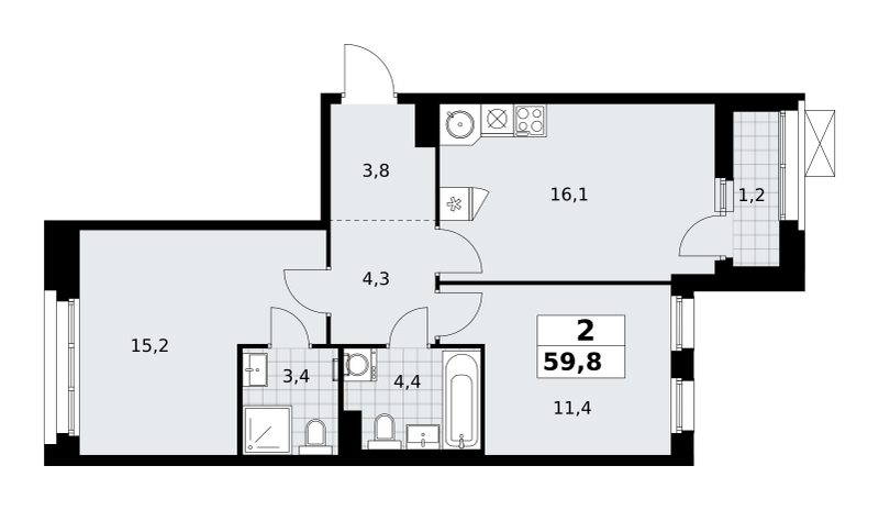 Евро 2-комнатная (59.8м2)