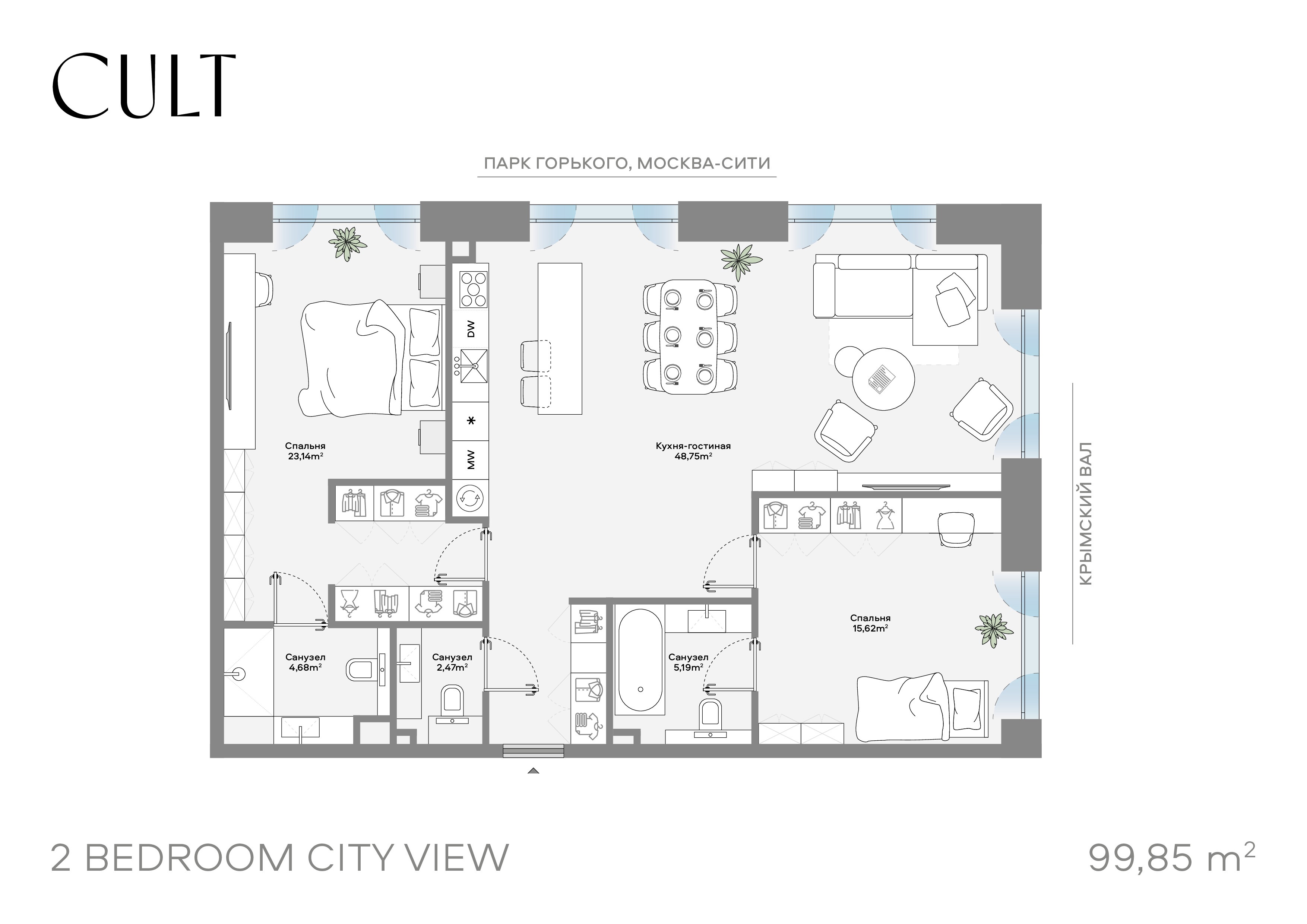 Он расположен в поистине уникальной локации: соседствуя с культовыми местами столицы – Центральным парком им. Горького, Нескучным садом, музеем современного искусства «Гараж» и Новой Третьяковкой, располагаясь всего в 2-х км от Кремля, в окружении парков и набережных, рядом с лучшими бутиками и ресторанами, CULT открывает безграничные возможности для своих резидентов.