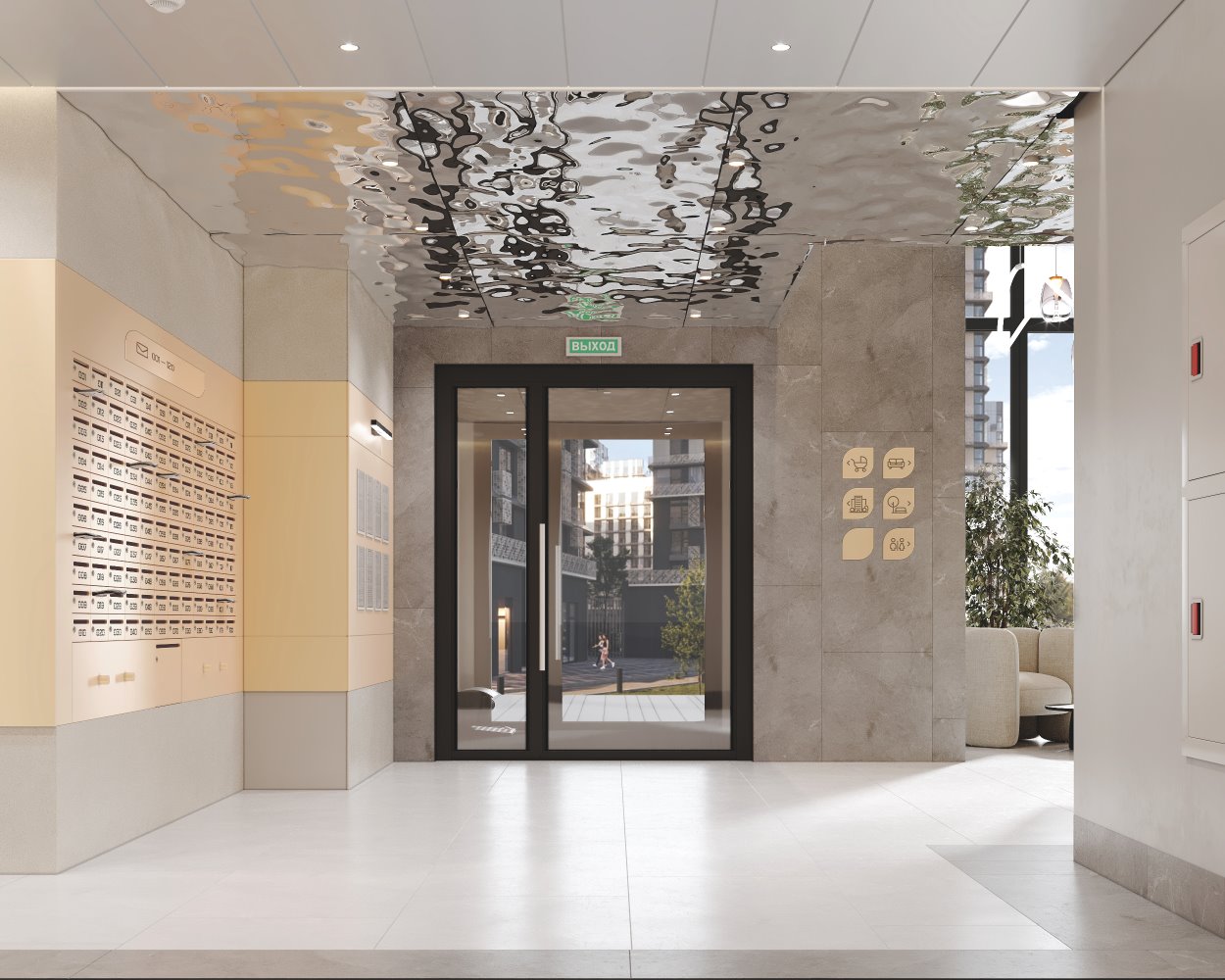 - Современный и минималистичный дизайн интерьера лобби с гостевым сан. узлом, колясочными и лапомойками