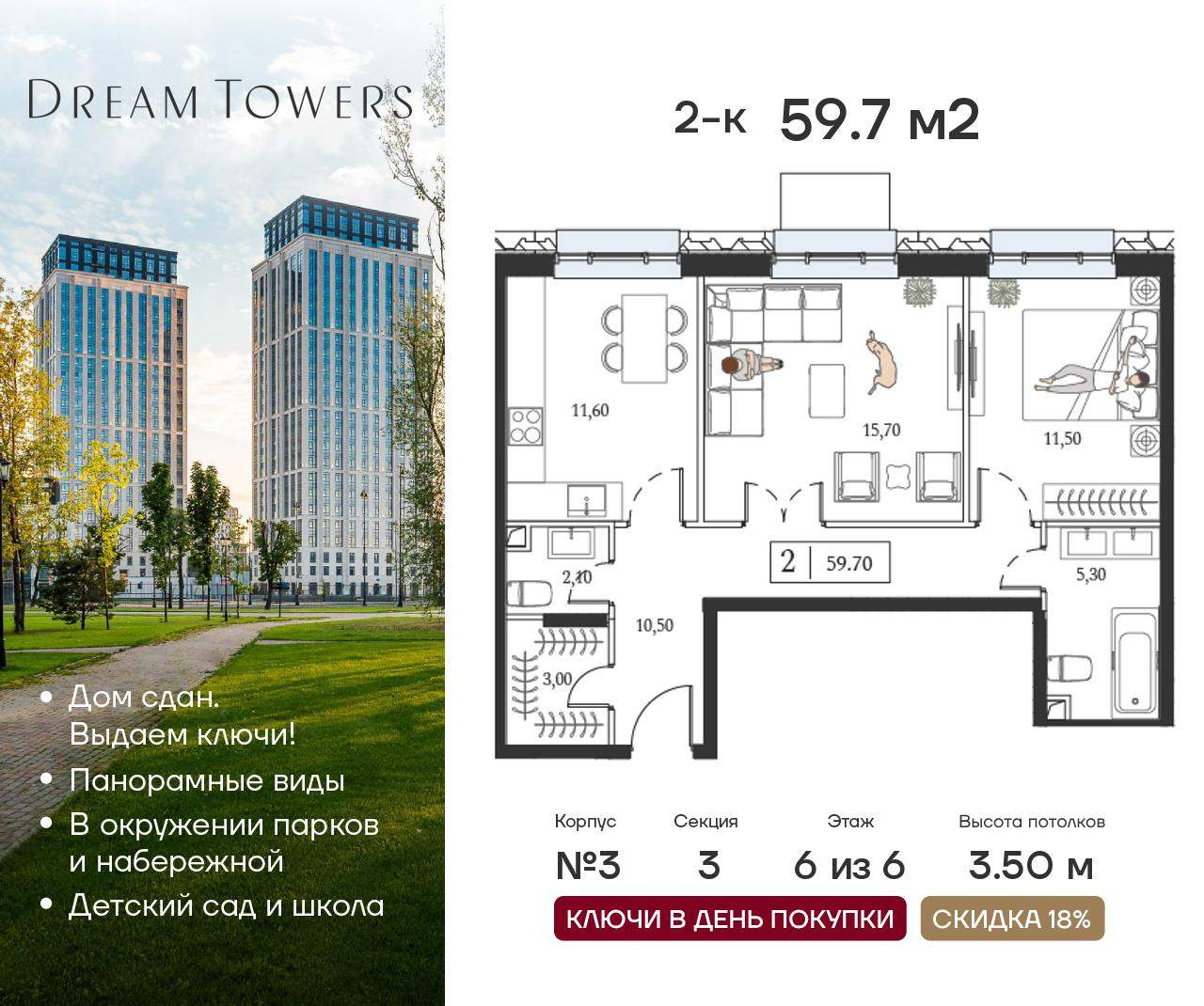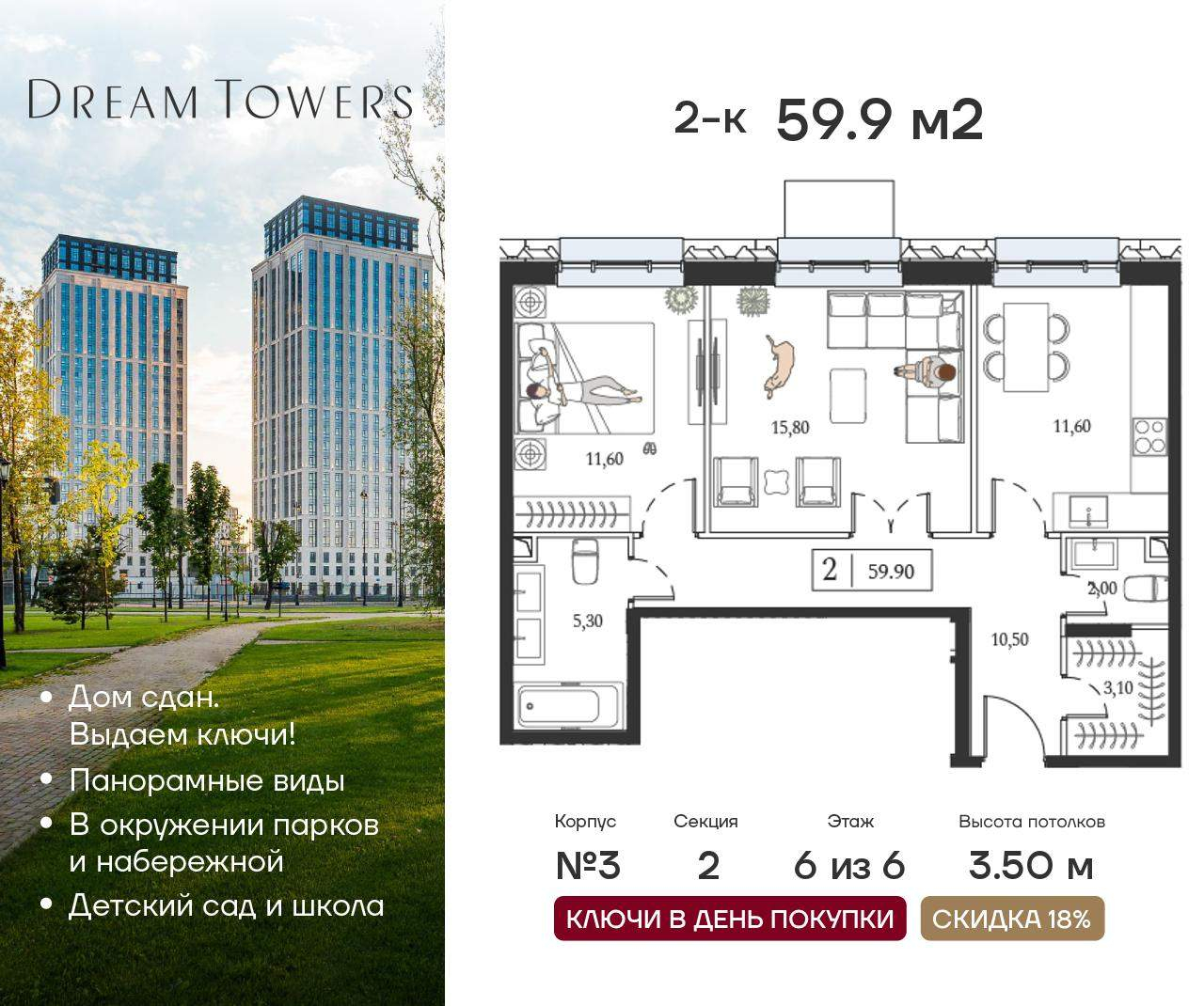 Двухкомнатные квартиры в ЖК Dream Towers (Дрим Тауэрс)